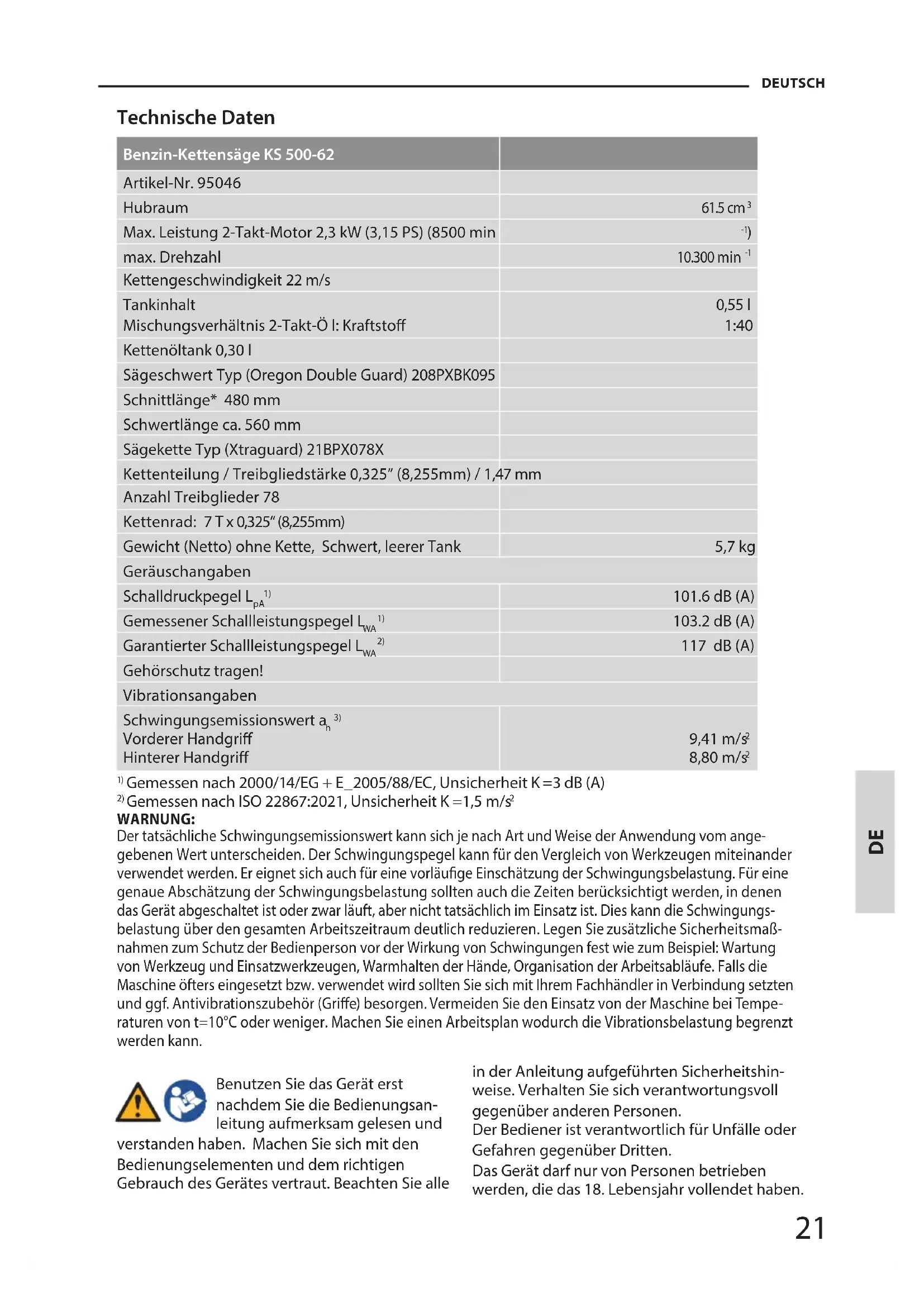 Technische Daten Benzin-Kettensäge KS 500-62 Artikel-Nr. 95046 Hubraum