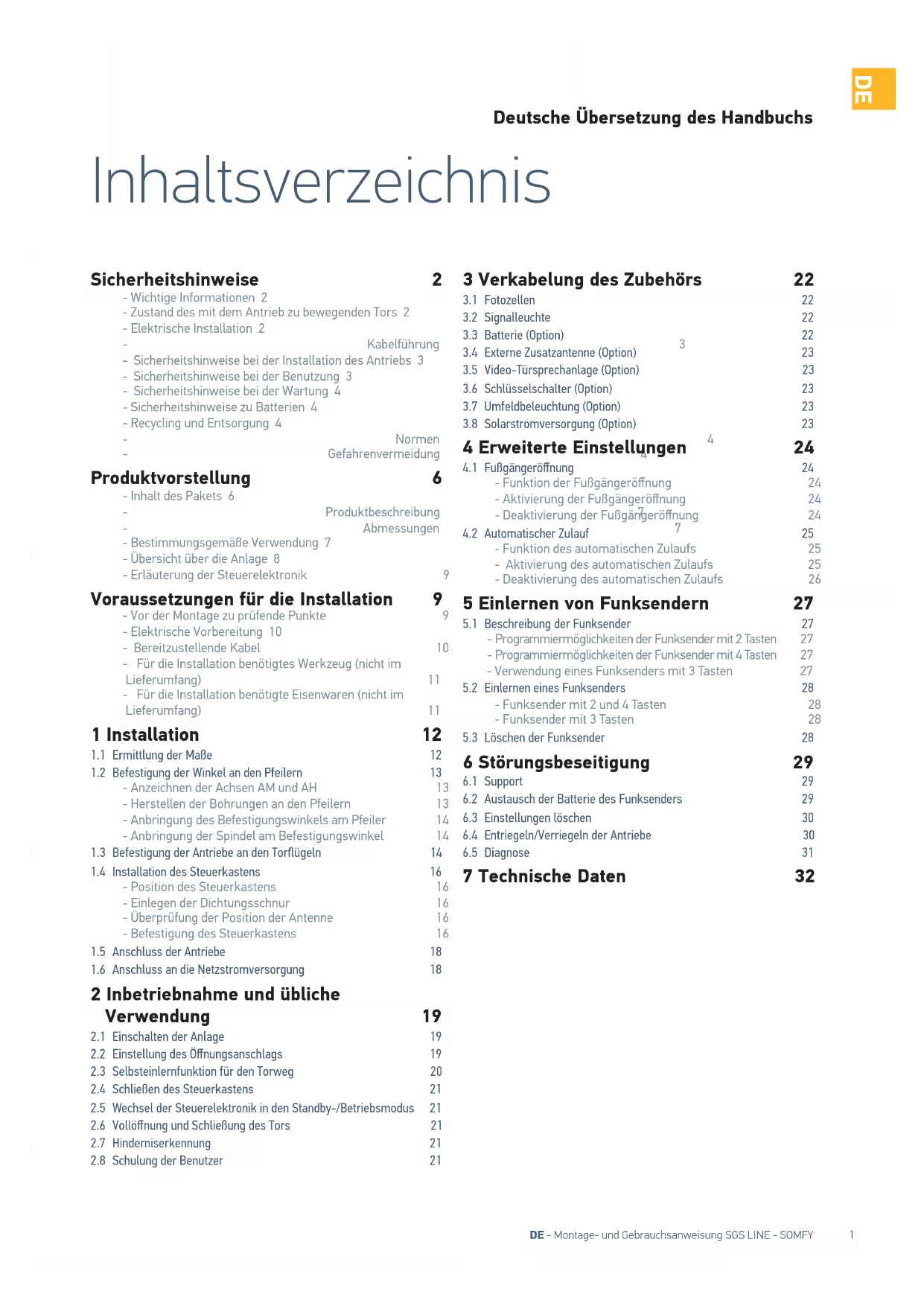 Deutsche Übersetzung des Handbuchs Inhaltsverzeichnis Sicherheitshinweise 2 - Wichtige Informationen 2 - Zustand des mit dem Antrieb zu bewegenden Tors 2 - Elektrische Installation 2 - Kabelführung 3 - Sicherheitshinweise bei der Installation des Antriebs 3 - Sicherheitshinweise bei der Benutzung 3 - Sicherheitshinweise bei der Wartung 4 - Sicherheitshinweise zu Batterien 4 - Recycling und Entsorgung 4 - Normen 4 - Gefahrenvermeidung 4 Produktvorstellung 6 - Inhalt des Pakets 6 - Produktbeschreibung 7 - Abmessungen 7 - Bestimmungsgemäße Verwendung 7 - Übersicht über die Anlage 8 - Erläuterung der Steuerelektronik 9 Voraussetzungen für die Installation 9 - Vor der Montage zu prüfende Punkte 9 - Elektrische Vorbereitung 10 - Bereitzustellende Kabel 10 - Für die Installation benötigtes Werkzeug (nicht im Lieferumfang) 11 - Für die Installation benötigte Eisenwaren (nicht im Lieferumfang) 11 1 Installation 12