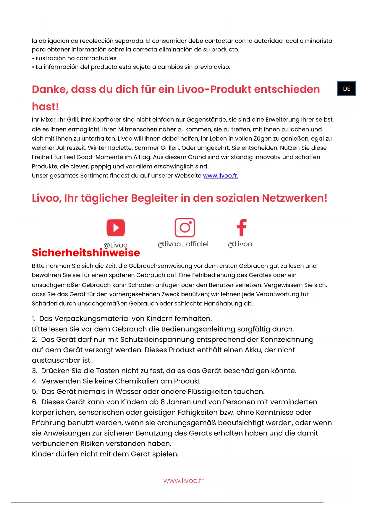 - La información del producto está sujeta a cambios sin previo aviso. Danke, dass du dich für ein Livoo-Produkt entschieden hast! Ihr Mixer, Ihr Grill, Ihre Kopfhörer sind nicht einfach nur Gegenstände, sie sind eine Erweiterung Ihrer selbst, die es Ihnen ermöglicht, Ihren Mitmenschen näher zu kommen, sie zu treffen, mit ihnen zu lachen und sich mit ihnen zu unterhalten. Livoo will Ihnen dabei helfen, ihr Leben in vollen Zügen zu genießen, egal zu welcher Jahreszeit. Winter Raclette, Sommer Grillen. Oder umgekehrt. Sie entscheiden. Nutzen Sie diese Freiheit für Feel Good-Momente im Alltag. Aus diesem Grund sind wir ständig innovativ und schaffen Produkte, die clever, peppig und vor allem erschwinglich sind. Unser gesamtes Sortiment findest du auf unserer Webseite www.livoo.fr. Livoo, Ihr täglicher Begleiter in den sozialen Netzwerken!