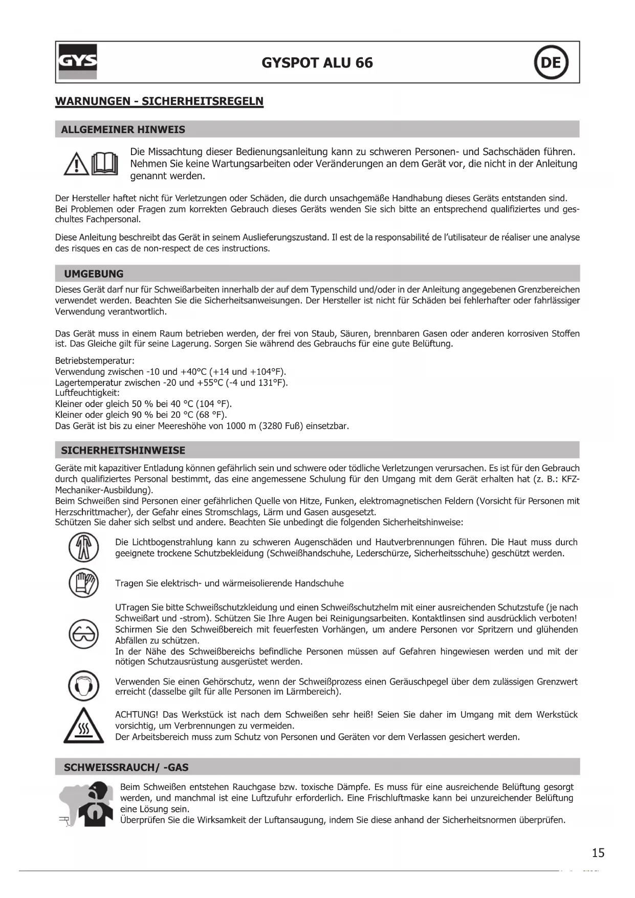 ALLGEMEINER HINWEIS Die Missachtung dieser Bedienungsanleitung kann zu schweren Personen- und Sachschäden führen. Nehmen Sie keine Wartungsarbeiten oder Veränderungen an dem Gerät vor, die nicht in der Anleitung genannt werden. Der Hersteller haftet nicht für Verletzungen oder Schäden, die durch unsachgemäße Handhabung dieses Geräts entstanden sind. Bei Problemen oder Fragen zum korrekten Gebrauch dieses Geräts wenden Sie sich bitte an entsprechend qualifiziertes und ges- chultes Fachpersonal. Diese Anleitung beschreibt das Gerät in seinem Auslieferungszustand. Il est de la responsabilité de l’utilisateur de réaliser une analyse des risques en cas de non-respect de ces instructions. UMGEBUNG Dieses Gerät darf nur für Schweißarbeiten innerhalb der auf dem Typenschild und/oder in der Anleitung angegebenen Grenzbereichen verwendet werden. Beachten Sie die Sicherheitsanweisungen. Der Hersteller ist nicht für Schäden bei fehlerhafter oder fahrlässiger Verwendung verantwortlich. Das Gerät muss in einem Raum betrieben werden, der frei von Staub, Säuren, brennbaren Gasen oder anderen korrosiven Stoffen ist. Das Gleiche gilt für seine Lagerung. Sorgen Sie während des Gebrauchs für eine gute Belüftung.Betriebstemperatur:Verwendung zwischen -10 und +40°C (+14 und +104°F).Lagertemperatur zwischen -20 und +55°C (-4 und 131°F).Luftfeuchtigkeit:Kleiner oder gleich 50 % bei 40 °C (104 °F).Kleiner oder gleich 90 % bei 20 °C (68 °F).Das Gerät ist bis zu einer Meereshöhe von 1000 m (3280 Fuß) einsetzbar. SICHERHEITSHINWEISE Geräte mit kapazitiver Entladung können gefährlich sein und schwere oder tödliche Verletzungen verursachen. Es ist für den Gebrauch durch qualifiziertes Personal bestimmt, das eine angemessene Schulung für den Umgang mit dem Gerät erhalten hat (z. B.: KFZ- Mechaniker-Ausbildung). Beim Schweißen sind Personen einer gefährlichen Quelle von Hitze, Funken, elektromagnetischen Feldern (Vorsicht für Personen mit Herzschrittmacher), der Gefahr eines Stromschlags, Lärm und Gasen ausgesetzt.Schützen Sie daher sich selbst und andere. Beachten Sie unbedingt die folgenden Sicherheitshinweise:Die Lichtbogenstrahlung kann zu schweren Augenschäden und Hautverbrennungen führen. Die Haut muss durch geeignete trockene Schutzbekleidung (Schweißhandschuhe, Lederschürze, Sicherheitsschuhe) geschützt werden.Tragen Sie elektrisch- und wärmeisolierende HandschuheUTragen Sie bitte Schweißschutzkleidung und einen Schweißschutzhelm mit einer ausreichenden Schutzstufe (je nach Schweißart und -strom). Schützen Sie Ihre Augen bei Reinigungsarbeiten. Kontaktlinsen sind ausdrücklich verboten!Schirmen Sie den Schweißbereich mit feuerfesten Vorhängen, um andere Personen vor Spritzern und glühenden Abfällen zu schützen.In der Nähe des Schweißbereichs befindliche Personen müssen auf Gefahren hingewiesen werden und mit der nötigen Schutzausrüstung ausgerüstet werden.Verwenden Sie einen Gehörschutz, wenn der Schweißprozess einen Geräuschpegel über dem zulässigen Grenzwert erreicht (dasselbe gilt für alle Personen im Lärmbereich).ACHTUNG! Das Werkstück ist nach dem Schweißen sehr heiß! Seien Sie daher im Umgang mit dem Werkstück vorsichtig, um Verbrennungen zu vermeiden.Der Arbeitsbereich muss zum Schutz von Personen und Geräten vor dem Verlassen gesichert werden. SCHWEISSRAUCH/ -GAS Beim Schweißen entstehen Rauchgase bzw. toxische Dämpfe. Es muss für eine ausreichende Belüftung gesorgt werden, und manchmal ist eine Luftzufuhr erforderlich. Eine Frischluftmaske kann bei unzureichender Belüftung eine Lösung sein.Überprüfen Sie die Wirksamkeit der Luftansaugung, indem Sie diese anhand der Sicherheitsnormen überprüfen.16 GYSPOT ALU 66