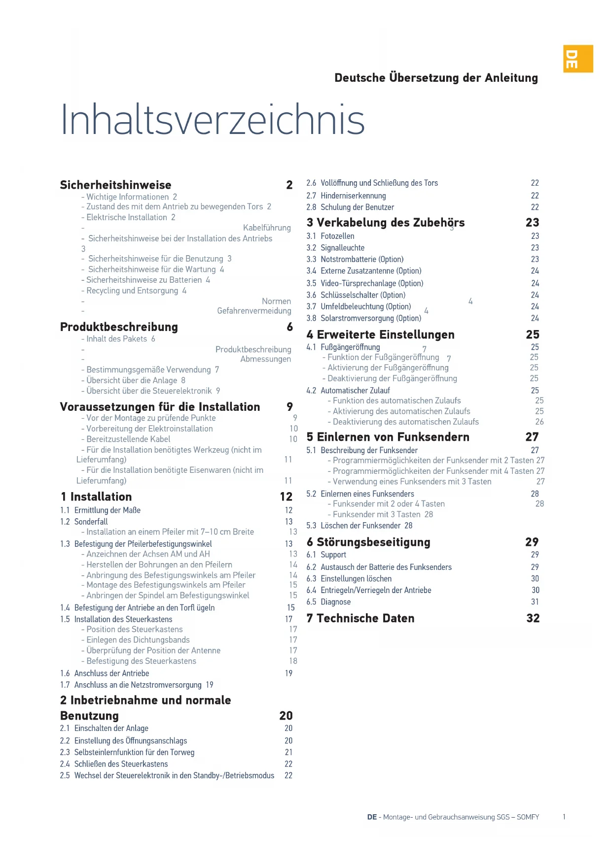 Deutsche Übersetzung der Anleitung Inhaltsverzeichnis Sicherheitshinweise 2 - Wichtige Informationen 2 - Zustand des mit dem Antrieb zu bewegenden Tors 2 - Elektrische Installation 2 - Kabelführung 3 - Sicherheitshinweise bei der Installation des Antriebs
