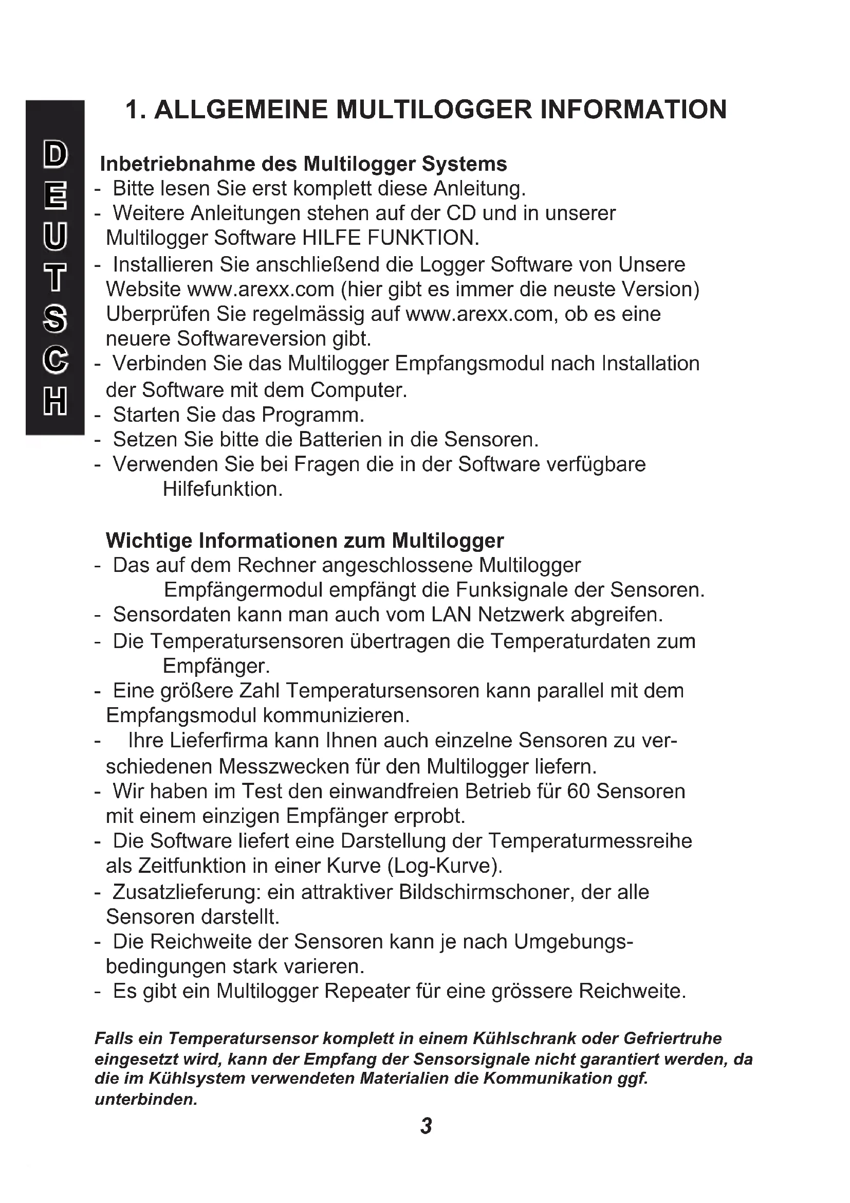 Inbetriebnahme des Multilogger Systems - Bitte lesen Sie erst komplett diese Anleitung. - Weitere Anleitungen stehen auf der CD und in unserer Multilogger Software HILFE FUNKTION. - Installieren Sie anschließend die Logger Software von Unsere Website www.arexx.com (hier gibt es immer die neuste Version) Uberprüfen Sie regelmässig auf www.arexx.com, ob es eine neuere Softwareversion gibt. - Verbinden Sie das Multilogger Empfangsmodul nach Installation der Software mit dem Computer. - Starten Sie das Programm. - Setzen Sie bitte die Batterien in die Sensoren. - Verwenden Sie bei Fragen die in der Software verfügbare Hilfefunktion. Wichtige Informationen zum Multilogger - Das auf dem Rechner angeschlossene Multilogger Empfängermodul empfängt die Funksignale der Sensoren. - Sensordaten kann man auch vom LAN Netzwerk abgreifen. - Die Temperatursensoren übertragen die Temperaturdaten zum Empfänger. - Eine größere Zahl Temperatursensoren kann parallel mit dem Empfangsmodul kommunizieren. - IhreLieferrmakannIhnenaucheinzelneSensorenzuver- schiedenen Messzwecken für den Multilogger liefern. - Wir haben im Test den einwandfreien Betrieb für 60 Sensoren mit einem einzigen Empfänger erprobt. - Die Software liefert eine Darstellung der Temperaturmessreihe als Zeitfunktion in einer Kurve (Log-Kurve). - Zusatzlieferung: ein attraktiver Bildschirmschoner, der alle Sensoren darstellt. - Die Reichweite der Sensoren kann je nach Umgebungs- bedingungen stark varieren. - Es gibt ein Multilogger Repeater für eine grössere Reichweite. Falls ein Temperatursensor komplett in einem Kühlschrank oder Gefriertruhe eingesetzt wird, kann der Empfang der Sensorsignale nicht garantiert werden, da die im Kühlsystem verwendeten Materialien die Kommunikation ggf. unterbinden.