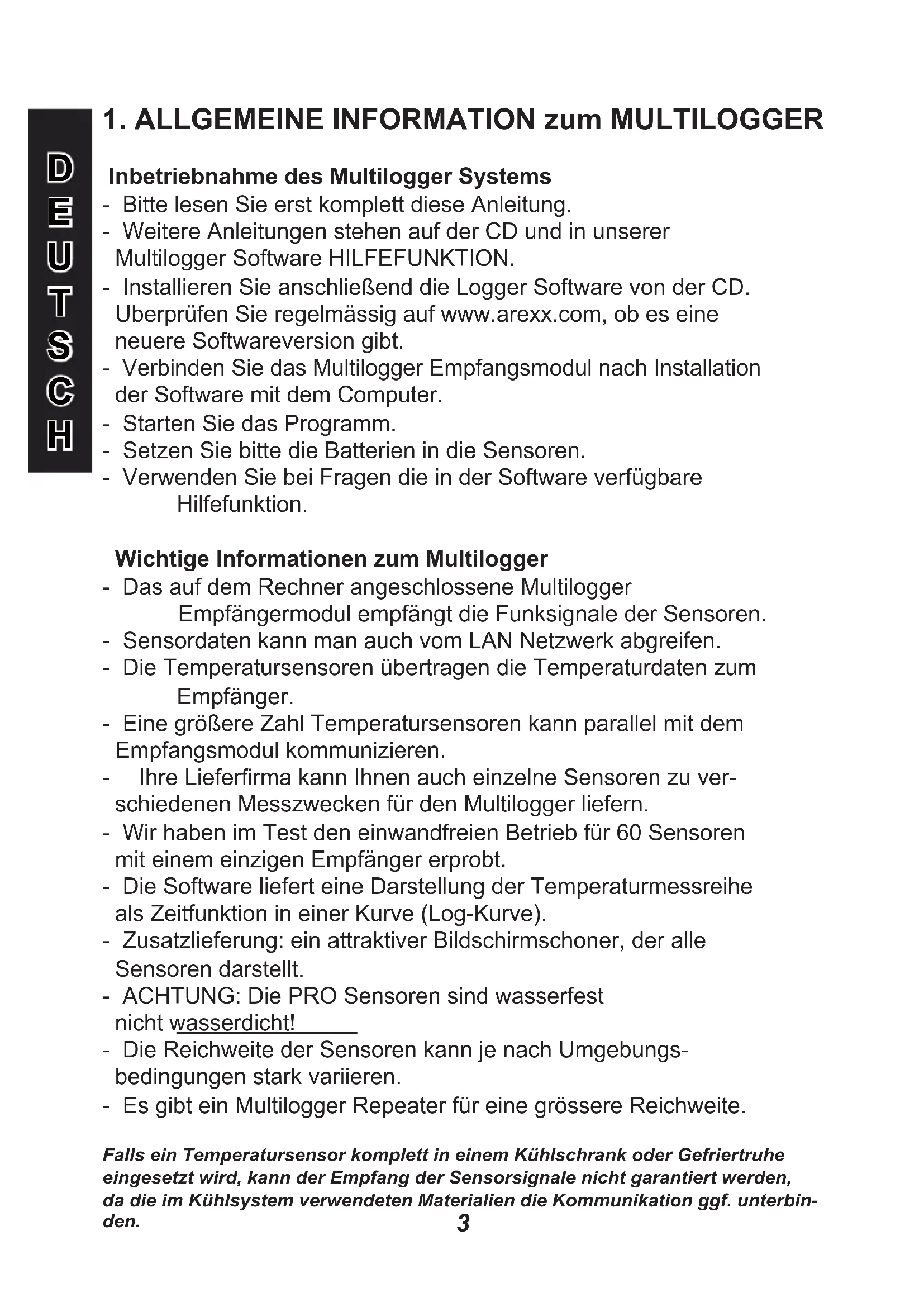 Inbetriebnahme des Multilogger Systems - Bitte lesen Sie erst komplett diese Anleitung. - Weitere Anleitungen stehen auf der CD und in unserer Multilogger Software HILFEFUNKTION. - Installieren Sie anschließend die Logger Software von der CD. Uberprüfen Sie regelmässig auf www.arexx.com, ob es eine neuere Softwareversion gibt. - Verbinden Sie das Multilogger Empfangsmodul nach Installation der Software mit dem Computer. - Starten Sie das Programm. - Setzen Sie bitte die Batterien in die Sensoren. - Verwenden Sie bei Fragen die in der Software verfügbare Hilfefunktion. Wichtige Informationen zum Multilogger - Das auf dem Rechner angeschlossene Multilogger Empfängermodul empfängt die Funksignale der Sensoren. - Sensordaten kann man auch vom LAN Netzwerk abgreifen. - Die Temperatursensoren übertragen die Temperaturdaten zum Empfänger. - Eine größere Zahl Temperatursensoren kann parallel mit dem Empfangsmodul kommunizieren. - IhreLieferrmakannIhnenaucheinzelneSensorenzuver- schiedenen Messzwecken für den Multilogger liefern. - Wir haben im Test den einwandfreien Betrieb für 60 Sensoren mit einem einzigen Empfänger erprobt. - Die Software liefert eine Darstellung der Temperaturmessreihe als Zeitfunktion in einer Kurve (Log-Kurve). - Zusatzlieferung: ein attraktiver Bildschirmschoner, der alle Sensoren darstellt. - ACHTUNG: Die PRO Sensoren sind wasserfest nicht wasserdicht! - Die Reichweite der Sensoren kann je nach Umgebungs- bedingungen stark variieren. - Es gibt ein Multilogger Repeater für eine grössere Reichweite. Falls ein Temperatursensor komplett in einem Kühlschrank oder Gefriertruhe eingesetzt wird, kann der Empfang der Sensorsignale nicht garantiert werden, da die im Kühlsystem verwendeten Materialien die Kommunikation ggf. unterbin- den.