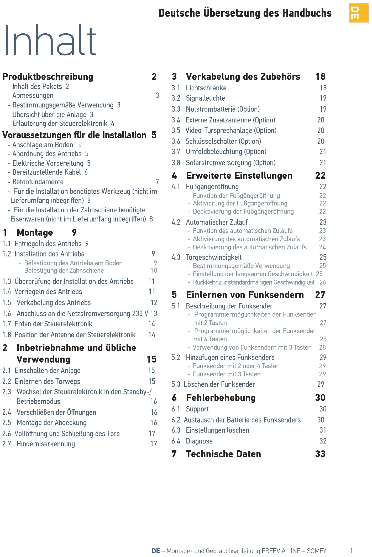 7 Technische Daten 33 Deutsche Übersetzung des Handbuchs2 DE – Montage- und Gebrauchsanleitung FREEVIA LINE – SOMFY
