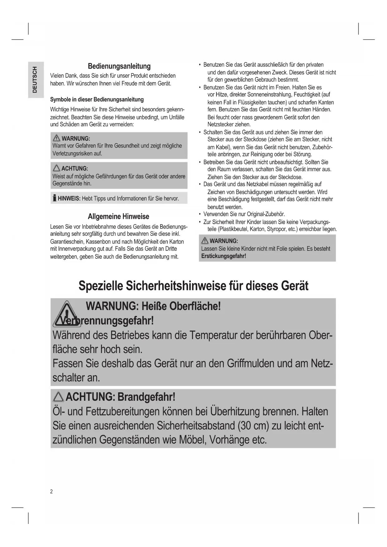 - Zur Sicherheit Ihrer Kinder lassen Sie keine Verpackungs- teile (Plastikbeutel, Karton, Styropor, etc.) erreichbar liegen. WARNUNG: Lassen Sie kleine Kinder nicht mit Folie spielen. Es besteht Erstickungsgefahr! Spezielle Sicherheitshinweise für dieses Gerät WARNUNG: Heiße Oberäche! Verbrennungsgefahr! Während des Betriebes kann die Temperatur der berührbaren Ober- äche sehr hoch sein. Fassen Sie deshalb das Gerät nur an den Griffmulden und am Netz- schalter an. ACHTUNG: Brandgefahr! Öl- und Fettzubereitungen können bei Überhitzung brennen. Halten Sie einen ausreichenden Sicherheitsabstand (30 cm) zu leicht ent- zündlichen Gegenständen wie Möbel, Vorhänge etc.3 Deutsch ACHTUNG: Dieses Gerät ist nicht dazu bestimmt, bei der Reinigung in Wasser eingetaucht zu werden. Beachten Sie die Anweisungen, die wir Ihnen im Kapitel „Reinigung“ dazu geben.