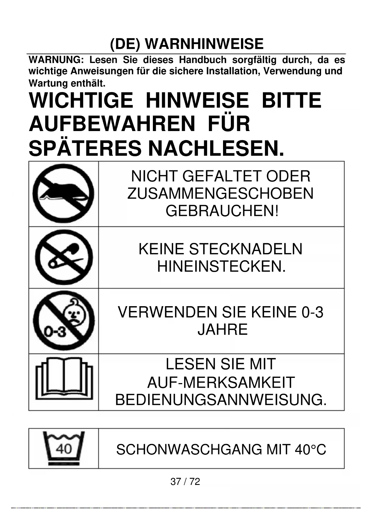 - ACHTUNG: Die Decke darf im eingeschalteten Zustand nicht gefaltet oder gerollt sein. - Garantiebescheinigung, fiskalische Quittung und Bedienungsanleitung für jede spätere Konsultation bitte aufbewahren. - Nach Entfernen der Verpackung vergewissere man sich der Integrität des Gerätes und sollte man bei dieser Überprüfung sichtbare Beschädigungen festestellen, das Gerät nicht benutzen und sich direkt an qualifiziertes Fachpersonal wenden. - Keine Verpackungsteile in der Reichweite von Kindern aufbewahren, um die Gefahr der Erstickung zu vermeiden. - Bevor man das Gerät an die Netzspannung anschließt, stelle man sicher daß die an der Steckdose liegende Spannung auch derjenigen des Typenschildes des Gerätes entspricht. - Wenn Stecker und Steckdose nicht kompatibel sind, lassen Sie die Steckdose von fachlich qualifiziertem Personal durch einen geeigneten Typ austauschen. - Keine Adapter oder Verlängerungsschnuren verwenden die nicht den Forderungen der gegenwärtig geltenden Sicherheitsnormen genügen oder die die Stromgrenzwerte überschreiten.43 / 72 - Gerätes von Stromversorgungsnetz trennen wenn es nicht in Betrieb ist. - Am Netzkabel oder am Gerät selbst nicht ziehen um Stecker aus der Steckdose herauszuziehen. - Der Gebrauch irgendeines Elektrogerätes erfordert immer die Beachtung einiger grundlegenden Regeln und zwar insbesondere: - Man darf niemals das Gerät mit nassen oder feuchten Händen berühren. - Das Gerät nicht den Witterungseinflüssen ausgesetzt lassen (Regen, Sonnenstrahlung). - Gerät nicht Schlag-oder Stoßbeanspruchungen aussetzen. - Sollten Sie sich dafür entscheiden diesen Gerät nicht mehr zu benutzen, so sind Sie angebrancht, das Gerät durch Abschneiden des Netzkabels unbenutzbar zu machen,natürlich nach dessen Abtrennung von der Steckdose. - Um eventuelle Überhitzungen zu vermeiden, es ist empfehlen, das Netzkabel für seine ganze Länge abzuwickeln. - Bei Vorliegen eines Defektes, einer Auslösung der Sicherung oder der Schmelzschutzsicherung, bzw. einer ungewöhnlichen Funktionsweise des Gerätes muss unverzüglich der Stecker gezogen werden, dürfen keine Veränderungen am Gerät vorgenommen werden und muss eine zugelassene Kundendienststelle verständigt werden. - Benutzen Sie das Gerät nicht im Freien. - Aus Sicherheitsgründen können das Gerät und die Steuereinheit nicht geöffnet werden.
