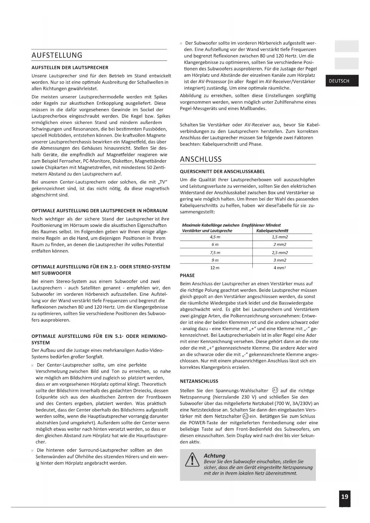 Unsere Lautsprecher sind für den Betrieb im Stand entwickelt worden. Nur so ist eine opmale Ausbreitung der Schallwellen in allen Richtungen gewährleistet. Die meisten unserer Lautsprechermodelle werden mit Spikes oder Kegeln zur akusschen Entkopplung ausgeliefert. Diese müssen in die dafür vorgesehenen Gewinde im Sockel der Lautsprecherbox eingeschraubt werden. Die Kegel bzw. Spikes ermöglichen einen sicheren Stand und mindern außerdem Schwingungen und Resonanzen, die bei besmmten Fussböden, speziell Holzböden, entstehen können. Die kravollen Magnete unserer Lautsprecherchassis bewirken ein Magneeld, das über die Abmessungen des Gehäuses hinausreicht. Stellen Sie des- halb Geräte, die empndlich auf Magneelder reagieren wie zum Beispiel Fernseher, PC-Monitore, Diskeen, Magnetbänder sowie Chipkarten mit Magnetstreifen, mit mindestens 50 Zen- metern Abstand zu den Lautsprechern auf. Bei unseren Center-Lautsprechern oder solchen, die mit „TV“ gekennzeichnet sind, ist das nicht nög, da diese magnesch abgeschirmt sind. OPTIMALE AUFSTELLUNG DER LAUTSPRECHER IN HÖRRAUM Noch wichger als der sichere Stand der Lautsprecher ist ihre Posionierung im Hörraum sowie die akusschen Eigenschaen des Raumes selbst. Im Folgenden geben wir Ihnen einige allge- meine Regeln an die Hand, um diejenigen Posionen in Ihrem Raum zu nden, an denen die Lautsprecher ihr volles Potenal enalten können. OPTIMALE AUFSTELLUNG FÜR EIN 2.1- ODER STEREO-SYSTEM MIT SUBWOOFER Bei einem Stereo-System aus einem Subwoofer und zwei Lautsprechern - auch Satelliten genannt - empfehlen wir, den Subwoofer im vorderen Hörbereich aufzustellen. Eine Aufstel- lung vor der Wand verstärkt efe Frequenzen und begrenzt die Reexionen zwischen 80 und 120 Hertz. Um die Klangergebnisse zu opmieren, sollten Sie verschiedene Posionen des Subwoo- fers ausprobieren. OPTIMALE AUFSTELLUNG FÜR EIN 5.1- ODER HEIMKINO- SYSTEM Der Auau und die Justage eines mehrkanaligen Audio-Video- Systems bedürfen großer Sorgfalt. Der Center-Lautsprecher sollte, um eine perfekte Verschmelzung zwischen Bild und Ton zu erreichen, so nahe wie möglich am Bildschirm und zugleich so platziert werden, dass er am vorgesehenen Hörplatz opmal klingt. Theoresch sollte der Bildschirm innerhalb des gedachten Dreiecks, dessen Eckpunkte sich aus den akusschen Zentren der Frontboxen und des Centers ergeben, platziert werden. Was praksch bedeutet, dass der Center oberhalb des Bildschirms aufgestellt werden sollte, wenn die Hauptlautsprecher vorrangig darunter abstrahlen (und umgekehrt). Außerdem sollte der Center wenn möglich etwas weiter nach hinten versetzt werden, so dass er den gleichen Abstand zum Hörplatz hat wie die Hauptlautspre- cher. Die hinteren oder Surround-Lautsprecher sollten an den Seitenwänden auf Ohrhöhe des sitzenden Hörers und ein wen- ig hinter dem Hörplatz angebracht werden. Der Subwoofer sollte im vorderen Hörbereich aufgestellt wer- den. Eine Aufstellung vor der Wand verstärkt efe Frequenzen und begrenzt Reexionen zwischen 80 und 120 Hertz. Um die Klangergebnisse zu opmieren, sollten Sie verschiedene Posi- onen des Subwoofers ausprobieren. Für die Justage der Pegel am Hörplatz und Abstände der einzelnen Kanäle zum Hörplatz ist der AV-Prozessor (in aller Regel im AV-Receiver/Verstärker integriert) zuständig. Um eine opmale räumliche. Abbildung zu erreichen, sollten diese Einstellungen sorgfälg vorgenommen werden, wenn möglich unter Zuhilfenahme eines Pegel-Messgeräts und eines Maßbandes. Schalten Sie Verstärker oder AV-Receiver aus, bevor Sie Kabel- verbindungen zu den Lautsprechern herstellen. Zum korrekten Anschluss der Lautsprecher müssen Sie folgende zwei Faktoren beachten: Kabelquerschni und Phase. ANSCHLUSS