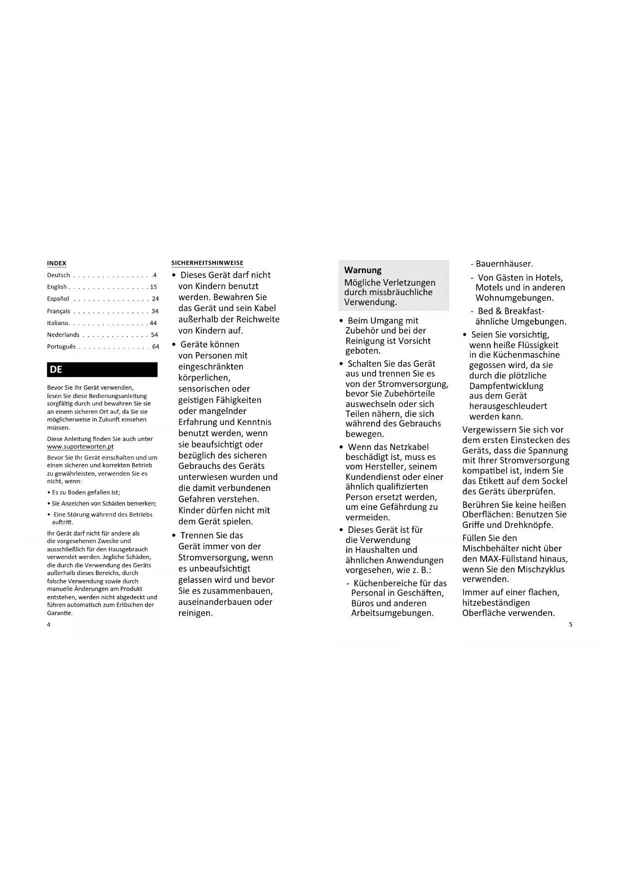 - Eine Störung während des Betriebs auri. Ihr Gerät darf nicht für andere als die vorgesehenen Zwecke und ausschließlich für den Hausgebrauch verwendet werden. Jegliche Schäden, die durch die Verwendung des Geräts außerhalb dieses Bereichs, durch falsche Verwendung sowie durch manuelle Änderungen am Produkt entstehen, werden nicht abgedeckt und führen automasch zum Erlöschen der Garane. INDEX Deutsch . . . . . . . . . . . . . . . . .4 English . . . . . . . . . . . . . . . . .15 Español . . . . . . . . . . . . . . . . 24 Français . . . . . . . . . . . . . . . . 34 Italiano. . . . . . . . . . . . . . . . .44 Nederlands . . . . . . . . . . . . . . 54 Português . . . . . . . . . . . . . . . 64 SICHERHEITSHINWEISE