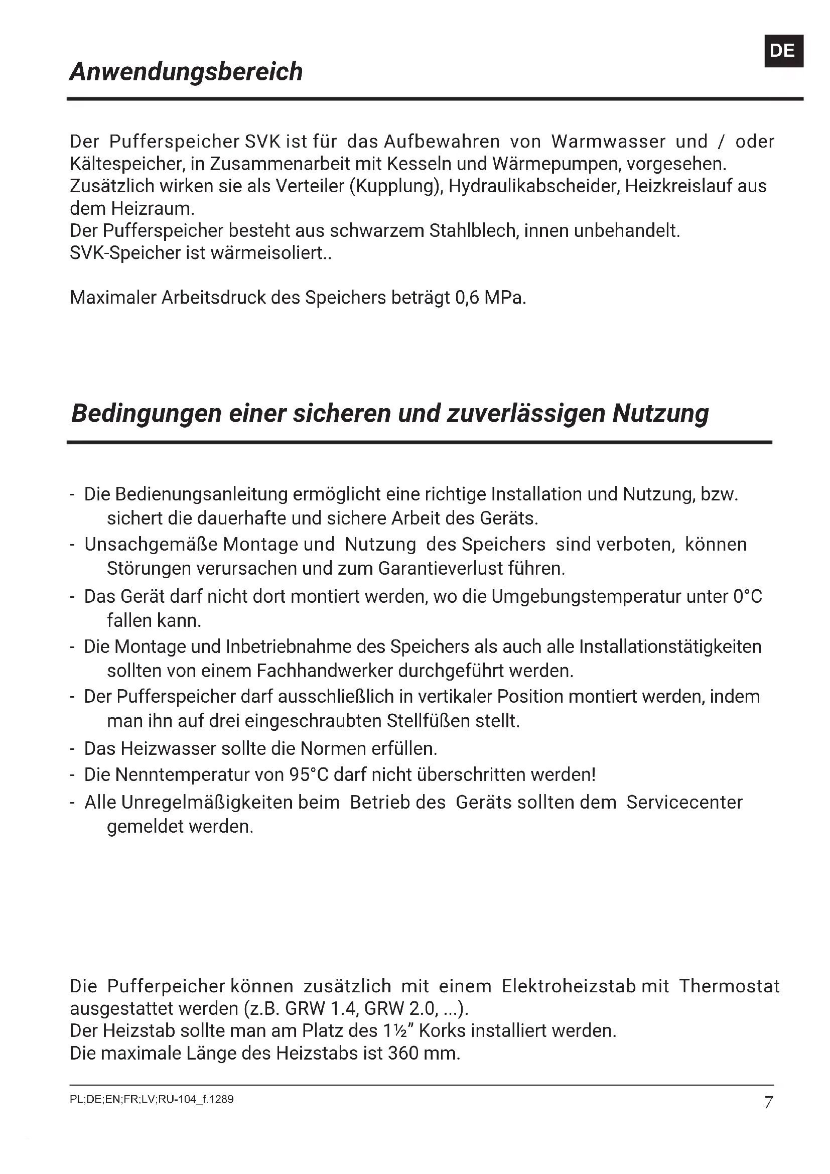 B 906 Masa (bez wody) kg 48 Dane techniczne Sposób postępowania w przypadku wystąpienia uszkodzeń lub nieprawidłowości Nieprawidłowość Instrukcja postępowania Wyciek wody ze zbiornika należy zakręcić zawory odcinające insta- lacje CO i skontaktować się z serwisem Nadmierny wzrost ciśnienia w zbiorniku7 PL;DE;EN;FR;LV;RU-104_f.1289 Der Pufferspeicher SVK ist für das Aufbewahren von Warmwasser und / oder Kältespeicher, in Zusammenarbeit mit Kesseln und Wärmepumpen, vorgesehen. Zusätzlich wirken sie als Verteiler (Kupplung), Hydraulikabscheider, Heizkreislauf aus dem Heizraum. Der Pufferspeicher besteht aus schwarzem Stahlblech, innen unbehandelt. SVK-Speicher ist wärmeisoliert.. Maximaler Arbeitsdruck des Speichers beträgt 0,6 MPa. Anwendungsbereich - Die Bedienungsanleitung ermöglicht eine richtige Installation und Nutzung, bzw. sichert die dauerhafte und sichere Arbeit des Geräts. - Unsachgemäße Montage und Nutzung des Speichers sind verboten, können Störungen verursachen und zum Garantieverlust führen. - Das Gerät darf nicht dort montiert werden, wo die Umgebungstemperatur unter 0°C fallen kann. - Die Montage und Inbetriebnahme des Speichers als auch alle Installationstätigkeiten sollten von einem Fachhandwerker durchgeführt werden. - Der Pufferspeicher darf ausschließlich in vertikaler Position montiert werden, indem man ihn auf drei eingeschraubten Stellfüßen stellt. - Das Heizwasser sollte die Normen erfüllen. - Die Nenntemperatur von 95°C darf nicht überschritten werden! - Alle Unregelmäßigkeiten beim Betrieb des Geräts sollten dem Servicecenter gemeldet werden. Bedingungen einer sicheren und zuverlässigen Nutzung Die Pufferpeicher können zusätzlich mit einem Elektroheizstab mit Thermostat ausgestattet werden (z.B. GRW 1.4, GRW 2.0, ...). Der Heizstab sollte man am Platz des 1½” Korks installiert werden. Die maximale Länge des Heizstabs ist 360 mm. DE8