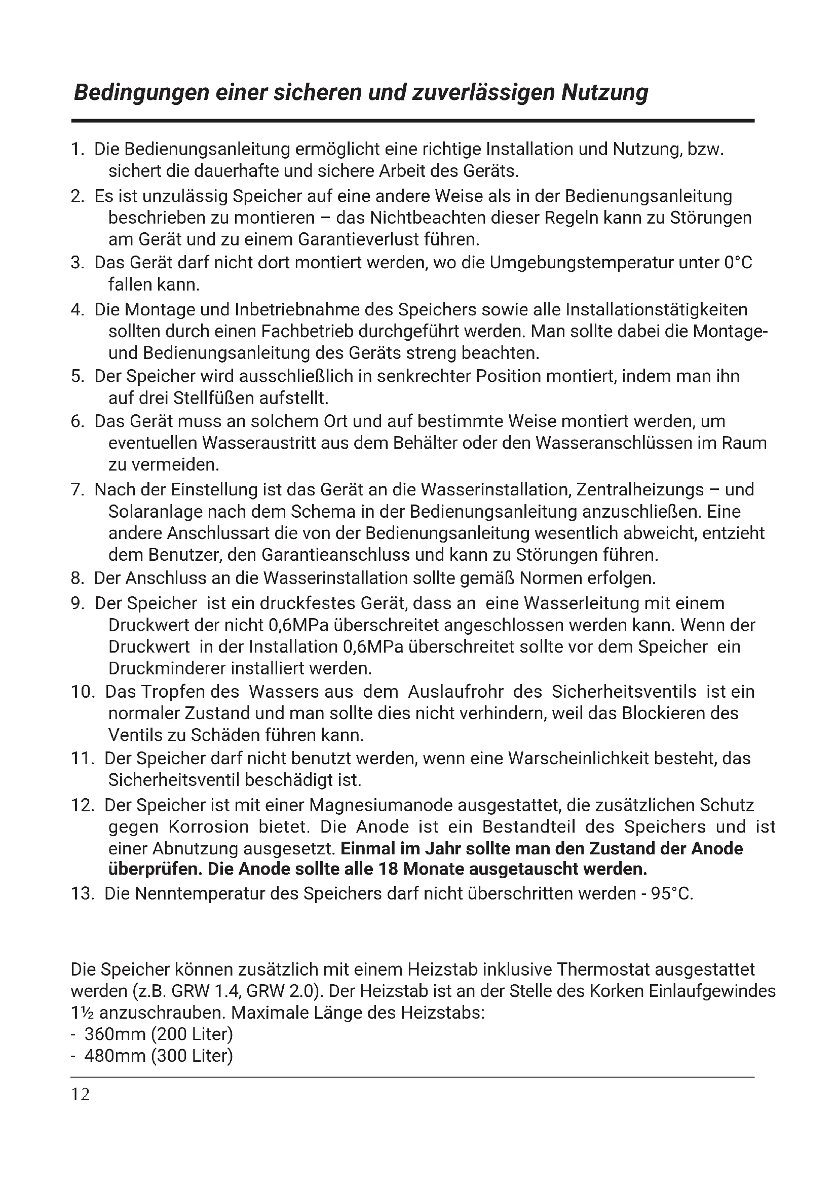 13. Die Nenntemperatur des Speichers darf nicht überschritten werden - 95°C.