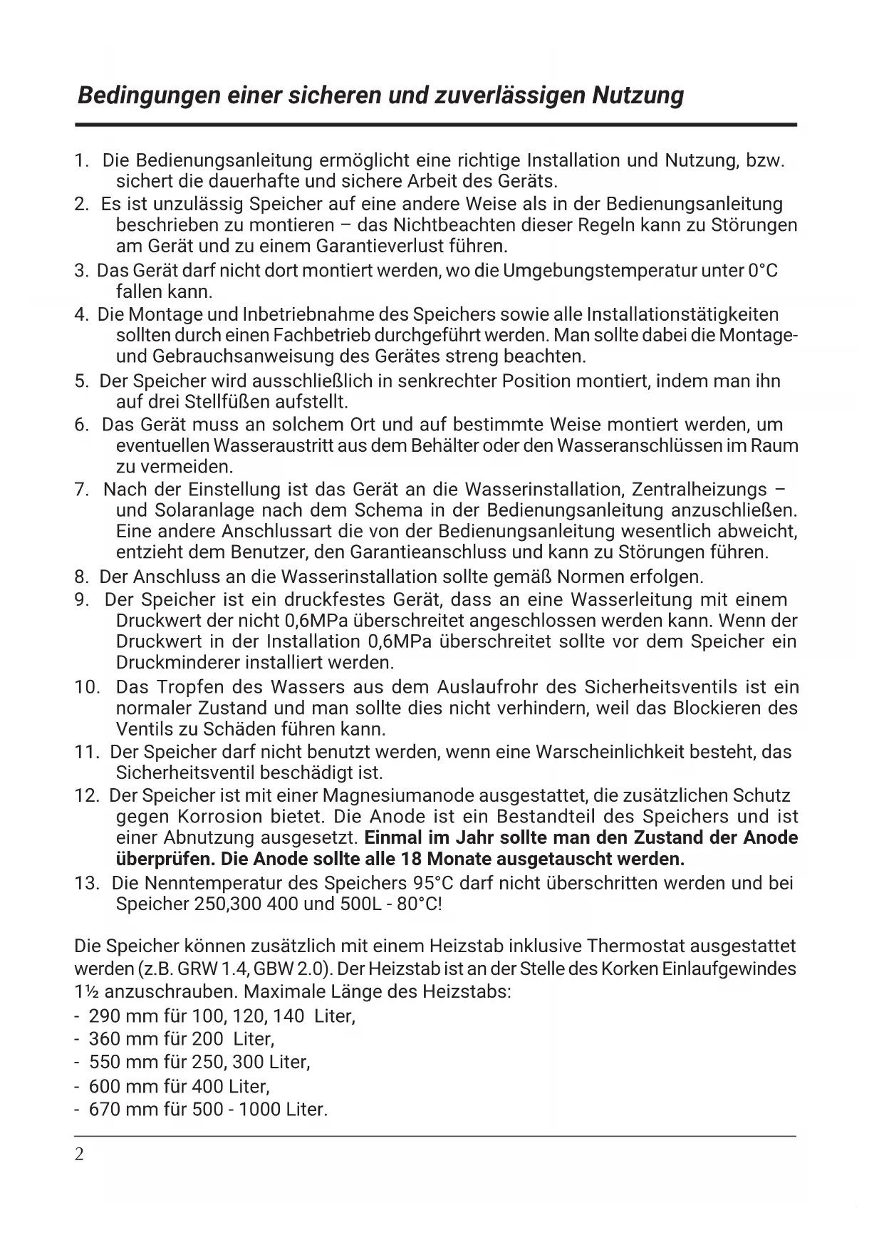 Speicher 250,300 400 und 500L - 80°C! Die Speicher können zusätzlich mit einem Heizstab inklusive Thermostat ausgestattet werden (z.B. GRW 1.4, GBW 2.0). Der Heizstab ist an der Stelle des Korken Einlaufgewindes 1½ anzuschrauben. Maximale Länge des Heizstabs: - 290 mm für 100, 120, 140 Liter, - 360 mm für 200 Liter, - 550 mm für 250, 300 Liter, - 600 mm für 400 Liter, - 670 mm für 500 - 1000 Liter.3 DE;EN;FR-036_f.1638 Anschluss an eine Zentralheizungsanlage Der Anschluss an die Zentralheizungsanlage sollte über Anschlussverschraubungen 1″ (1½″ - 1000 Liter) erfolgen wobei vor den Anschlussverschraubungen die Absperrventile einzusetzen sind. In der Installation des Zwangsumlaufs (mit Umwälzpumpe der Zentralheizungsanlage) damit der Speicher die in der Tabelle „Technischen Daten” volle Leistung erreicht sollte man einen entsprechenden Warmwasserdurchlauf sichern. Das SW-Modell ist mit einem Heizregister ausgestattet, SB-Modell besitzt zwei Heizregistern, die über einen Anschluss zum Heizkessel oder einer Solaranlage verfügen. Die SB- und SBZ-Modell sind in zusätzliche Stutzen zum Anschluss eines externen Speichers ausgestattet.