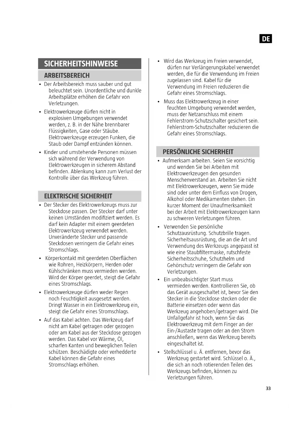 - Kinder und umstehende Personen müssen sich während der Verwendung von Elektrowerkzeugen in sicherem Abstand benden. Ablenkung kann zum Verlust der Kontrolle über das Werkzeug führen. ELEKTRISCHE SICHERHEIT