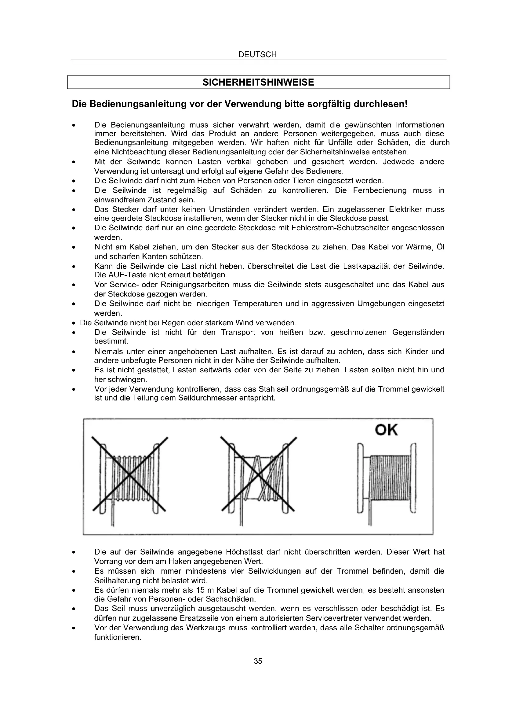 BEDIENUNG Anwendungsbereiche Mit der Seilwinde können Lasten mit einer maximale Belastung gemäß Typenschild vertikal gehoben und gesichert werden. Das Gerät darf nur bestimmungsgemäß verwendet werden. Jede andere Verwendung gilt als nicht bestimmungsgemäß. Der Hersteller haftet nicht für Schäden, die aufgrund einer solchen Verwendung entstehen; es haftet ausschließlich der Anwender. Vor der Inbetriebnahme