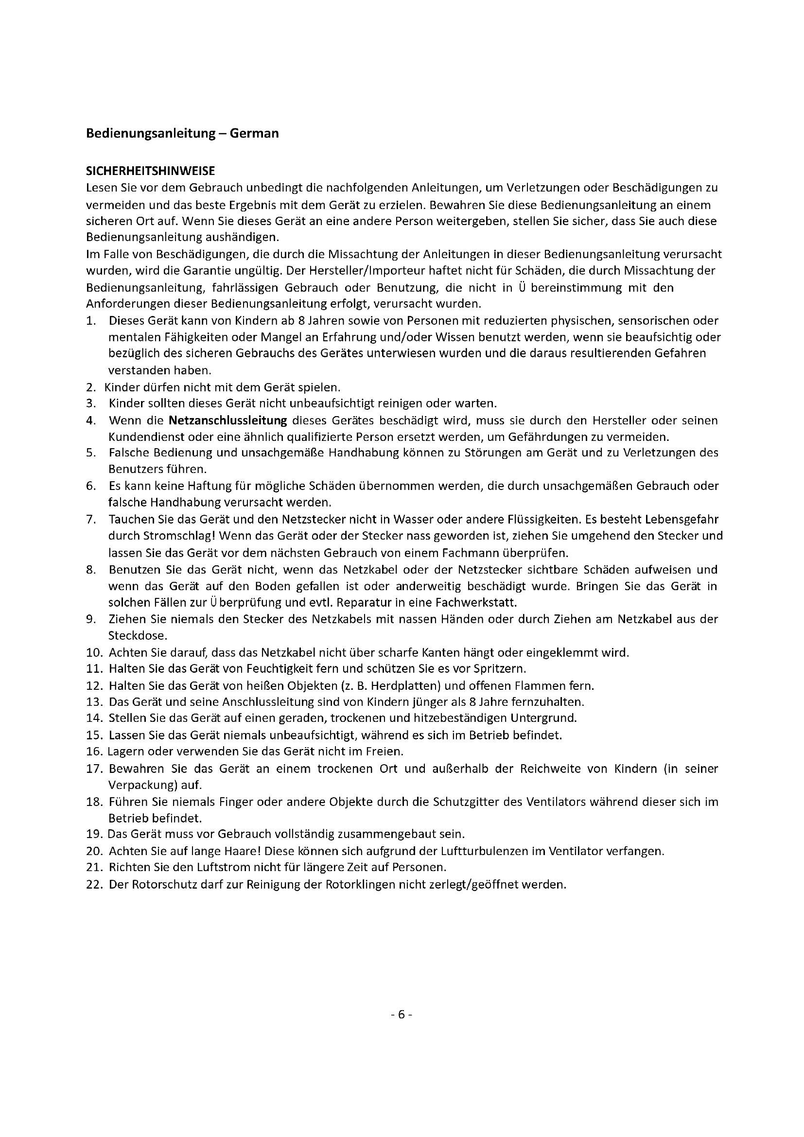 22. Der Rotorschutz darf zur Reinigung der Rotorklingen nicht zerlegt/geöffnet werden.- 7 -