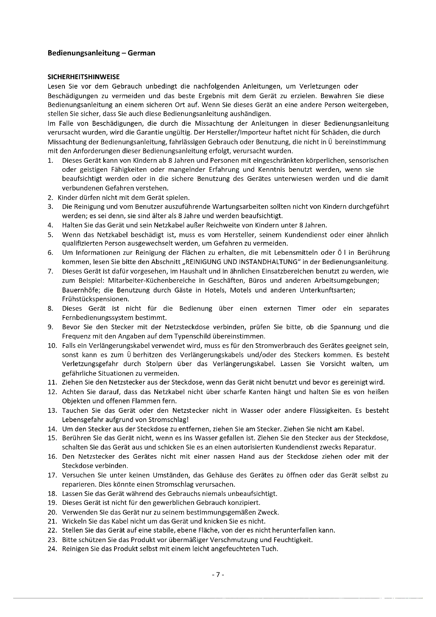 Manufactured by: Emerio B.V. Oudeweg 115, 2031 CC Haarlem, The Netherlands- 7 - Bedienungsanleitung – German SICHERHEITSHINWEISE Lesen Sie vor dem Gebrauch unbedingt die nachfolgenden Anleitungen, um Verletzungen oder Beschädigungen zu vermeiden und das beste Ergebnis mit dem Gerät zu erzielen. Bewahren Sie diese Bedienungsanleitung an einem sicheren Ort auf. Wenn Sie dieses Gerät an eine andere Person weitergeben, stellen Sie sicher, dass Sie auch diese Bedienungsanleitung aushändigen. Im Falle von Beschädigungen, die durch die Missachtung der Anleitungen in dieser Bedienungsanleitung verursacht wurden, wird die Garantie ungültig. Der Hersteller/Importeur haftet nicht für Schäden, die durch Missachtung der Bedienungsanleitung, fahrlässigen Gebrauch oder Benutzung, die nicht in Ü bereinstimmung mit den Anforderungen dieser Bedienungsanleitung erfolgt, verursacht wurden.