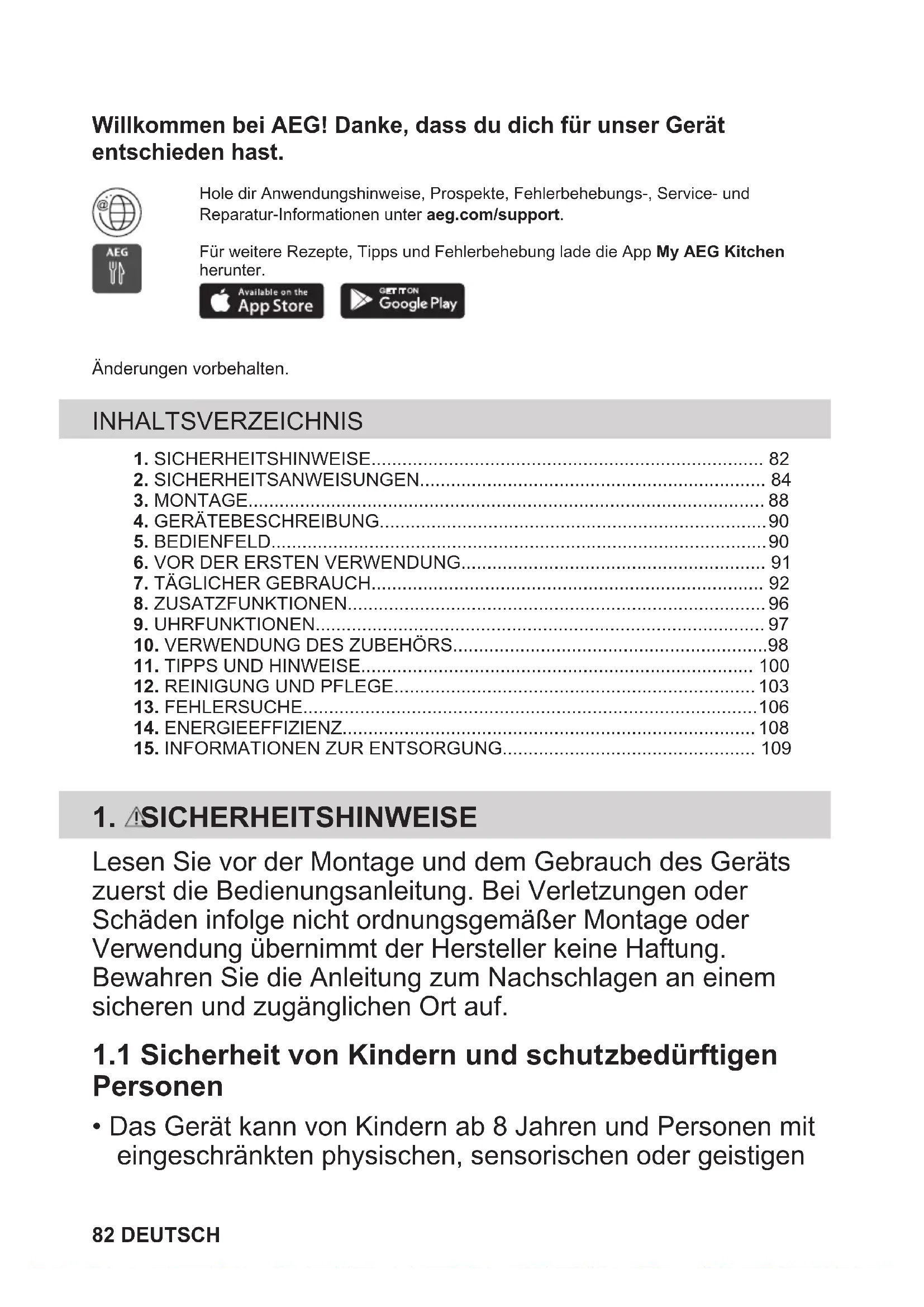 - Das Gerät kann von Kindern ab 8 Jahren und Personen mit eingeschränkten physischen, sensorischen oder geistigen 82 DEUTSCHFähigkeiten oder mit mangelnder Erfahrung/mangelndem Wissen benutzt werden, wenn sie durch eine für ihre Sicherheit zuständige Person beaufsichtigt werden oder von dieser Person Anweisungen erhalten haben, wie das Gerät sicher zu bedienen ist und welche Gefahren bei nicht ordnungsgemäßer Bedienung bestehen. Kinder unter 8 Jahren und Personen mit schweren Behinderungen oder Mehrfachbehinderung sollten vom Gerät ferngehalten werden, wenn sie nicht ständig beaufsichtigt werden.