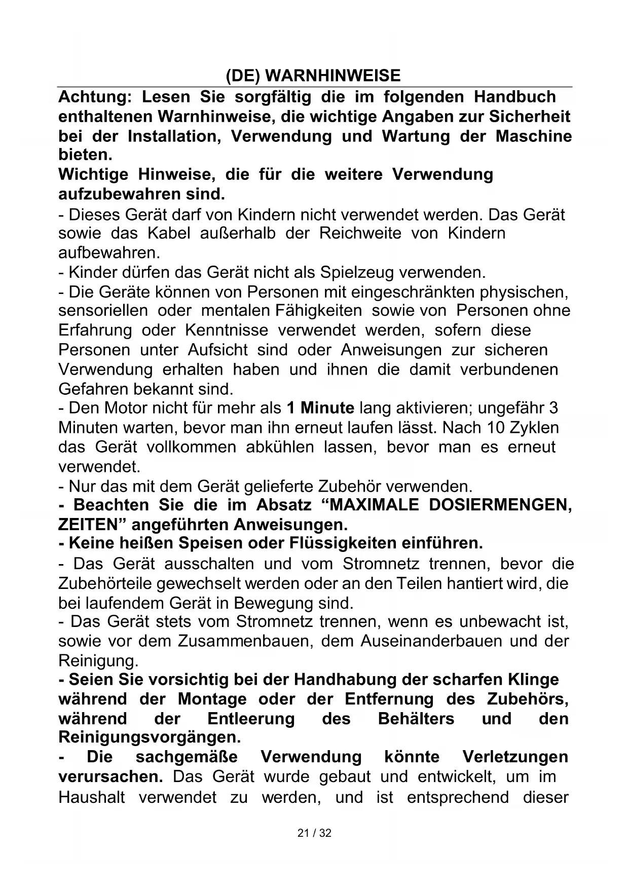 (FR) GARANTIE Conditions La garantie a une durée de 24 mois à compter de la date d’achat. Cette garantie est valable seulement si correctement compilée et accompagnée du ticket de caisse qui confirme la date d’achat. L’appareil doit être remis exclusivement à notre SAV agréé. La garantie couvre la substitution ou la réparation des composants de l’appareil défectueux à l’origine à cause de vices de fabrication. Nous garantissons toute de même l’assistance (payante) même des produits hors garantie. Le consommateur est titulaire des droits applicables par la législation nationale disciplinant la vente de biens de consommations ; cette garantie ne compromet pas les droits en question. Le fabricant décline toute responsabilité pour les éventuels dommages physiques ou matériels dérivant de l’utilisation impropre de l’appareil et du non-respect des consignes indiquées dans le manuel. Limitations Tous les droits de garantie et toutes nos responsabilités déchoient si l’appareil a été : -modifié de la part de personnel non autorisé. -utilisé, conservé ou transporté de façon impropre. La garantie ne couvre pas les pertes de prestations esthétiques ou celles qui ne compromettent pas l’origine des fonctions. Si malgré l’attention dédiée au choix des composants et l’engagement dans la réalisation du produit que vous venez d’acheter vous remarquez des défauts ou si vous avez besoin d’informations, veuillez vous adresser au revendeur de zone.21 / 32 (DE) WARNHINWEISE Achtung: Lesen Sie sorgfältig die im folgenden Handbuch enthaltenen Warnhinweise, die wichtige Angaben zur Sicherheit bei der Installation, Verwendung und Wartung der Maschine bieten. Wichtige Hinweise, die für die weitere Verwendung aufzubewahren sind. - Dieses Gerät darf von Kindern nicht verwendet werden. Das Gerät sowie das Kabel außerhalb der Reichweite von Kindern aufbewahren. - Kinder dürfen das Gerät nicht als Spielzeug verwenden. - Die Geräte können von Personen mit eingeschränkten physischen, sensoriellen oder mentalen Fähigkeiten sowie von Personen ohne Erfahrung oder Kenntnisse verwendet werden, sofern diese Personen unter Aufsicht sind oder Anweisungen zur sicheren Verwendung erhalten haben und ihnen die damit verbundenen Gefahren bekannt sind. - Den Motor nicht für mehr als 1 Minute lang aktivieren; ungefähr 3 Minuten warten, bevor man ihn erneut laufen lässt. Nach 10 Zyklen das Gerät vollkommen abkühlen lassen, bevor man es erneut verwendet. - Nur das mit dem Gerät gelieferte Zubehör verwenden. - Beachten Sie die im Absatz “MAXIMALE DOSIERMENGEN, ZEITEN” angeführten Anweisungen. - Keine heißen Speisen oder Flüssigkeiten einführen. - Das Gerät ausschalten und vom Stromnetz trennen, bevor die Zubehörteile gewechselt werden oder an den Teilen hantiert wird, die bei laufendem Gerät in Bewegung sind. - Das Gerät stets vom Stromnetz trennen, wenn es unbewacht ist, sowie vor dem Zusammenbauen, dem Auseinanderbauen und der Reinigung. - Seien Sie vorsichtig bei der Handhabung der scharfen Klinge während der Montage oder der Entfernung des Zubehörs, während der Entleerung des Behälters und den Reinigungsvorgängen. - Die sachgemäße Verwendung könnte Verletzungen verursachen. Das Gerät wurde gebaut und entwickelt, um im Haushalt verwendet zu werden, und ist entsprechend dieser22 / 32 Bedienungsanleitung einzusetzen; alle anderen Verwendungsarten gelten als unsachgemäß und sind daher gefährlich. - Sollte das Netzkabel beschädigt sein, darf es nur bei vom Hersteller autorisierten Kundendienstzentren ausgetauscht werden, um jeglichem Risiko vorzubeugen. - Für die Reinigung des Geräts, siehe Abschnitt WARTUNG. - Vor der ersten Verwendung des Geräts sind die Teile, die mit den Lebensmitteln in Kontakt geraten, wie im Abschnitt WARTUNG angeführt zu reinigen. - Das Gerät darf nicht mit einer externen Zeitschaltuhr oder einem separaten Fernbedienungssystem betrieben werden. - ACHTUNG: Um jegliche Gefährdung durch ein versehentliches Zurücksetzen der Thermoschutzvorrichtung zu vermeiden, darf dieses Gerät nicht durch ein externes Betriebsgerät, wie z. B. eine Zeitschaltuhr, mit Strom versorgt werden oder an einen Stromkreis angeschlossen werden, der regelmäßig mit Strom versorgt oder vom Netz getrennt wird. - Dieses Gerät ist nicht für den professionellen Gebrauch bestimmt. - ACHTUNG! Das Gerät nicht an die Stromversorgung anschließen und nicht verwenden, wenn es nicht vollständig montiert ist. - Das Gerät nicht ohne Deckel (2) und Dosierkappe (1) verwenden. - Das Gerät im Falle von Funktionsstörung nicht verwenden. - Das Gerät nicht verwenden, wenn es beschädigt ist. - Dieses Gerät ist für die Verwendung auf einer maximalen Höhe von 2000m über dem Meeresspiegel bestimmt. - Das Gerät kann bei 50Hz oder 60Hz ohne Einstellungen funktionieren. Bewahren Sie die Garantie, die Quittung und die Gebrauchsanweisung zum weiteren Nachschlagen auf. Überprüfen Sie nach dem Auspacken die Unversehrtheit des Geräts und verwenden Sie es nicht im Falle sichtbarer Schäden nicht, sondern wenden Sie sich an professionelles Fachpersonal. Keine Verpackungsteile in der Reichweite von Kindern aufbewahren, um die Gefahr der Erstickung zu vermeiden. Vergewissern Sie sich vor dem Anschluss des Geräts, dass die Spannung der Steckdose mit der auf dem Typenschild angegebenen Spannung übereinstimmt. Wenn Stecker und Steckdose nicht kompatibel sind, lassen Sie die Steckdose von fachlich qualifiziertem Personal durch einen geeigneten Typ austauschen. Verwenden Sie keine Adapter oder Verlängerungskabel, die nicht den aktuellen Sicherheitsvorschriften entsprechen oder die die Stromdurchgangsgrenzen überschreiten. Ziehen Sie nicht am Netzkabel oder am Gerät selbst, wenn Sie den Stecker aus der Steckdose ziehen. Bei der Verwendung von Elektrogeräten sind einige grundlegende Regeln zu beachten, insbesondere: - Berühren Sie das Gerät nicht mi
