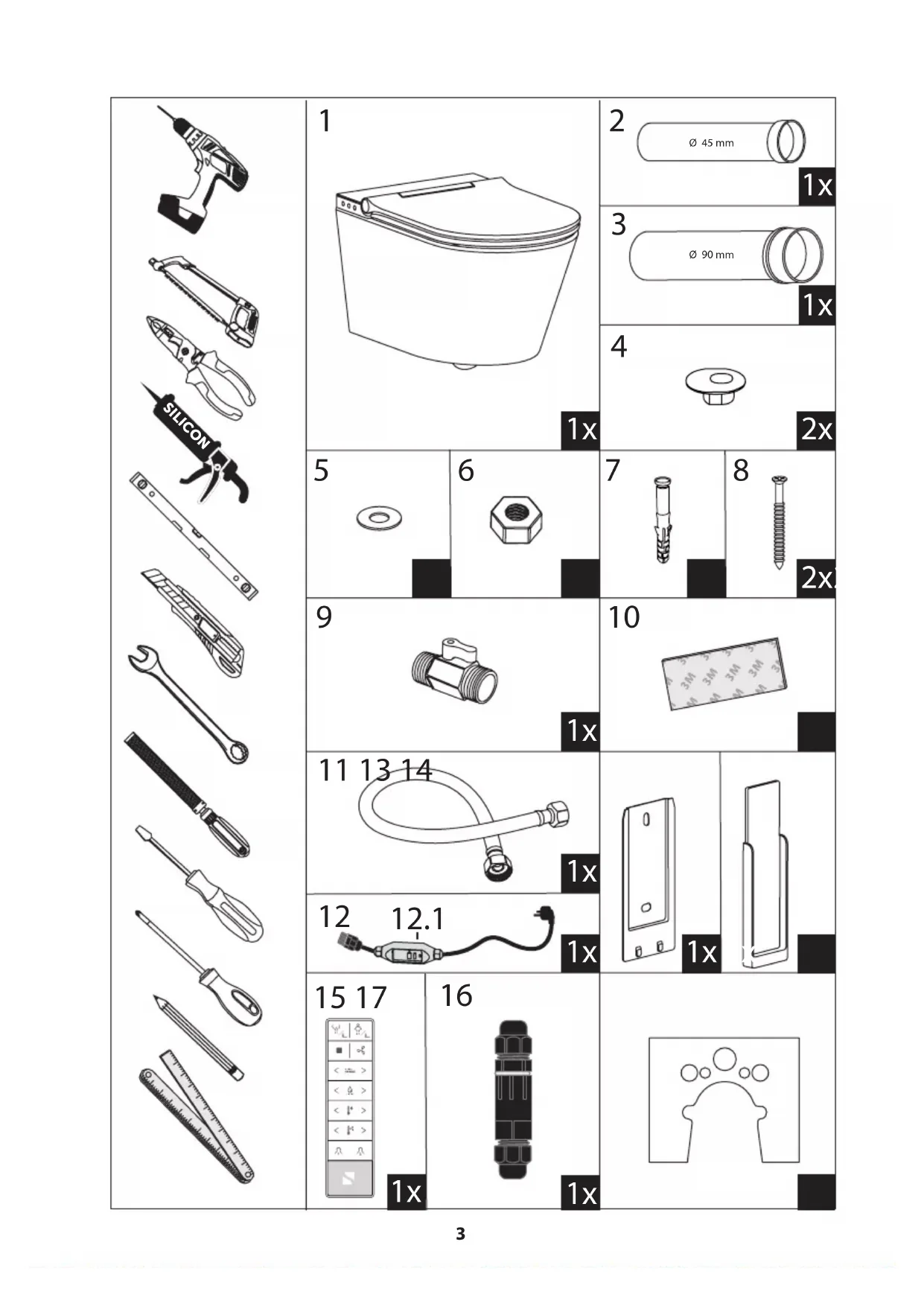 - Informieren Sie sich vor der Montage über das geeignete Montagematerial. Für die Montage an gängigen Vorwandelementen ist passendes Mon- tagematerial beigelegt.