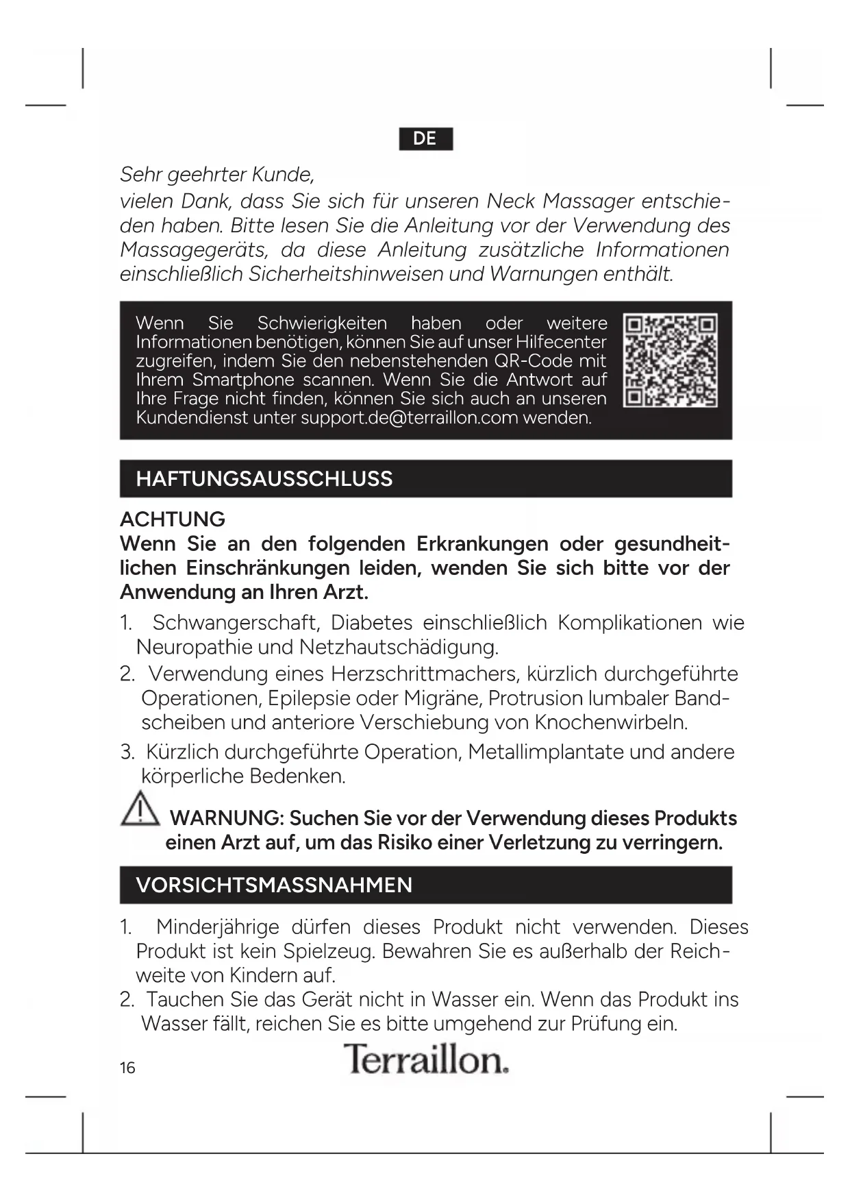 weite von Kindern auf 2 Tauchen Sie das Gerät nicht in Wasser ein Wenn das Produkt ins Wasser fällt, reichen Sie es bitte umgehend zur Prüfung ein Wenn Sie Schwierigkeiten haben oder weitere Informationen benötigen, können Sie auf unser Hilfecenter zugreifen, indem Sie den nebenstehenden QR-Code mit Ihrem Smartphone scannen Wenn Sie die Antwort auf Ihre Frage nicht finden, können Sie sich auch an unseren Kundendienst unter supportde@terrailloncom wenden17