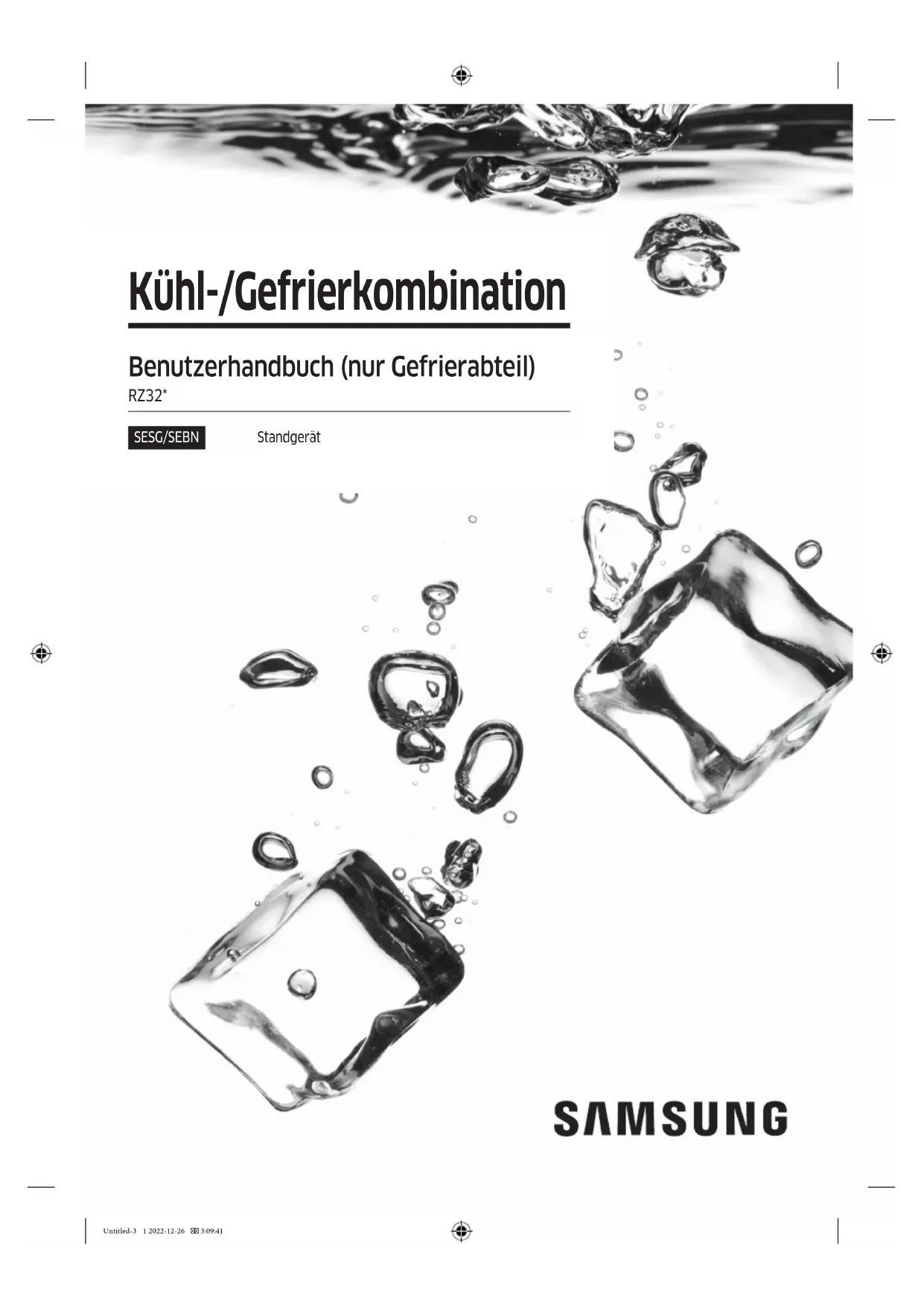 www.samsung.com/be/support (Dutch) www.samsung.com/be_fr/support (French) DA68-04420B-01 Untitled-5 72 2022-12-26 3:16:55Kühl-/Gefrierkombination Benutzerhandbuch (nur Gefrierabteil) RZ32* SESG/SEBN Standgerät Untitled-3 1 2022-12-26 3:09:41Deutsch2 Inhalt Inhalt Sicherheitsinformationen 3 Wichtige Symbole für Sicherheits- und Gefahrenhinweise: 6 Wichtige Warnhinweise für Transport und Aufstellungsort 7 Kritische Warnungen bei der Installation 7 Installationshinweise 12 Kritische Warnungen im Betrieb 13 Warnung im Betrieb 19 Warnhinweise im Betrieb 19 Warnhinweise zur Reinigung 22 Kritische Warnhinweise zur Entsorgung 23 Weitere Tipps zur ordnungsgemäßen Verwendung 25 Energiespartipps 26 Dieses Gerät ist zur Verwendung im Haushalt und ähnlichen Umgebungen bestimmt, wie z. B.: 27 Hinweise zur WEEE-Kennzeichnung 28 Aufstellen der Ladestation 29 Die Kühl-/Gefrierkombination auf einen Blick 29 Installation Schritt-für-Schritt 30 Bedienung 35 Funktionsbereich 35 Spezialfunktionen 37 Pege 42 Ändern der Anschlagseite für die Gerätetür (nur bestimmte Modelle) 42 Umbau und Pege 59 Reinigen 62 Ersetzen von Teilen 62 Fehlerbehebung 63 Allgemein 63 Hören Sie ungewöhnliche Geräusche aus dem Kühlschrank? 65 Anhang 67 Sicherheitshinweise 67 Installationsanleitung 67 Angaben zur Temperaturh 68 Modellinformationen und Bestellung von Ersatzteilen 71 Untitled-3 2 2022-12-26 3:09:41Deutsch 3 Sicherheitsinformationen