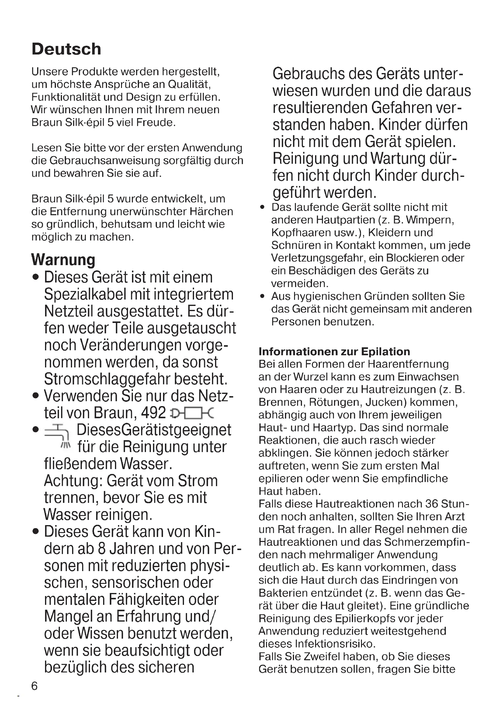 90340813_SE5_Power_MN.indd 590340813_SE5_Power_MN.indd 5 02.06.22 10:4902.06.22 10:496 Unsere Produkte werden hergestellt, um höchste Ansprüche an Qualität, Funktionalität und Design zu erfüllen. Wir wünschen Ihnen mit Ihrem neuen Braun Silk·épil 5 viel Freude. Lesen Sie bitte vor der ersten Anwendung die Gebrauchsanweisung sorgfältig durch und bewahren Sie sie auf. Braun Silk·épil 5 wurde entwickelt, um die Entfernung unerwünschter Härchen so gründlich, behutsam und leicht wie möglich zu machen. Warnung