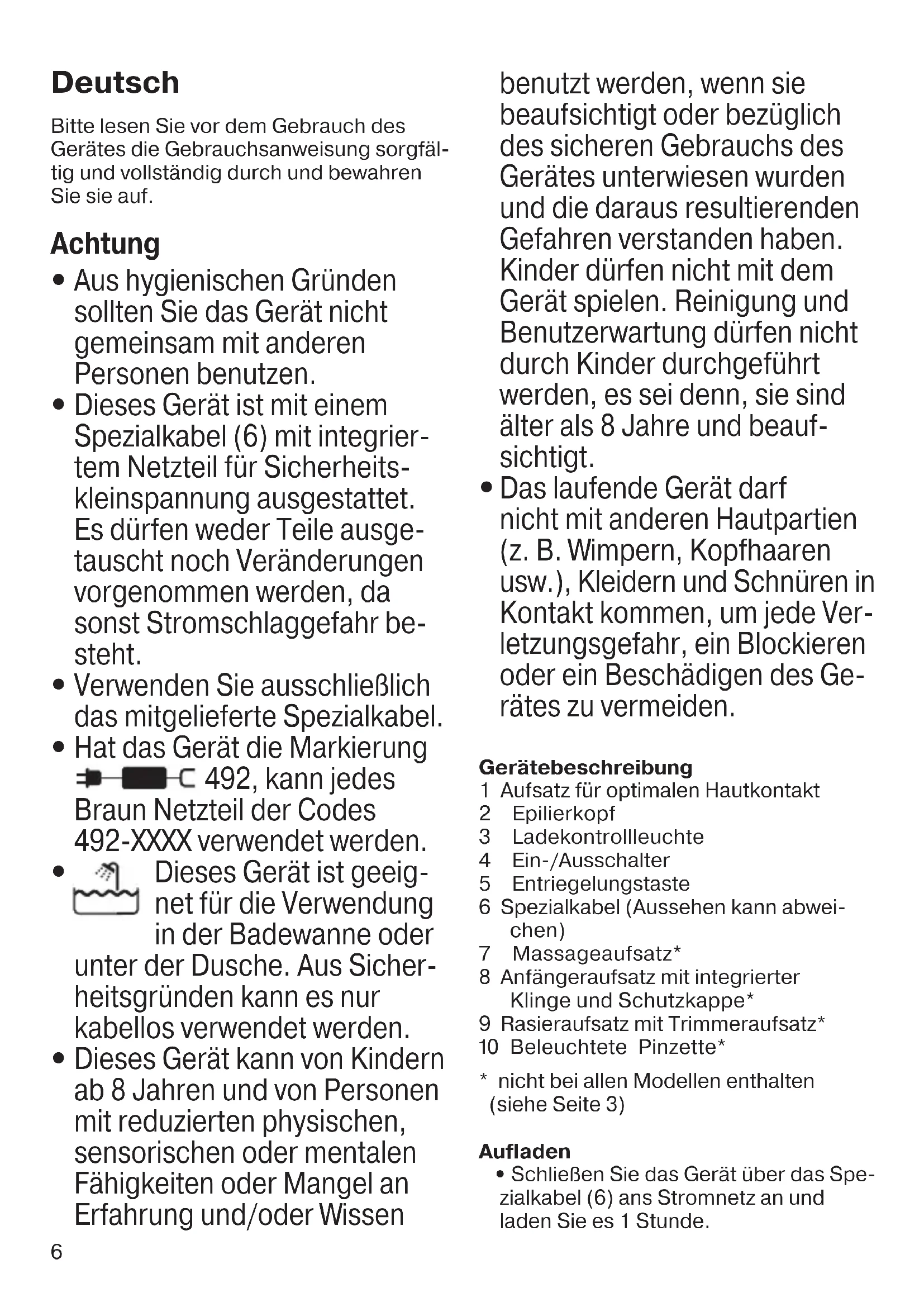 Das laufende Gerät darf nicht mit anderen Hautpartien (z. B. Wimpern, Kopfhaaren usw.), Kleidern und Schnüren in Kontakt kommen, um jede Ver- letzungsgefahr, ein Blockieren oder ein Beschädigen des Ge- rätes zu vermeiden. Gerätebeschreibung 1 Aufsatz für optimalen Hautkontakt 2 Epilierkopf 3 Ladekontrollleuchte 4 Ein-/Ausschalter 5 Entriegelungstaste 6 Spezialkabel (Aussehen kann abwei- chen) 7 Massageaufsatz* 8 Anfängeraufsatz mit integrierter Klinge und Schutzkappe* 9 Rasieraufsatz mit Trimmeraufsatz* 0 Beleuchtete Pinzette*
