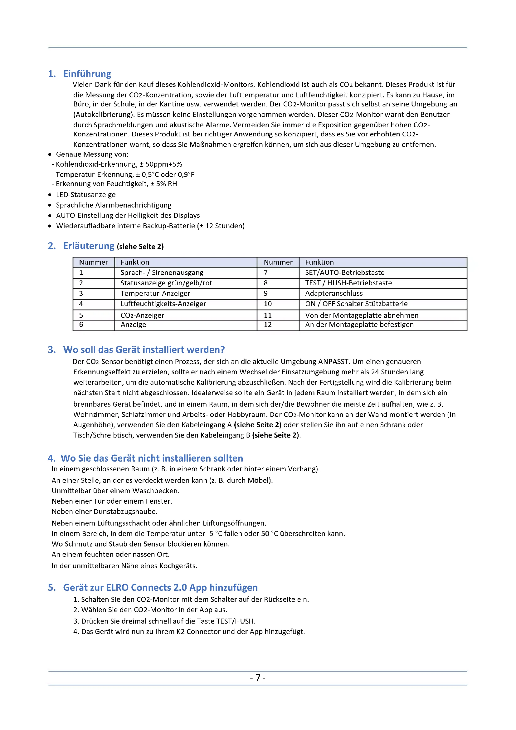 Vielen Dank für den Kauf dieses Kohlendioxid-Monitors, Kohlendioxid ist auch als CO2 bekannt. Dieses Produkt ist für die Messung der CO2-Konzentration, sowie der Lufttemperatur und Luftfeuchtigkeit konzipiert. Es kann zu Hause, im Büro, in der Schule, in der Kantine usw. verwendet werden. Der CO2-Monitor passt sich selbst an seine Umgebung an (Autokalibrierung). Es müssen keine Einstellungen vorgenommen werden. Dieser CO2-Monitor warnt den Benutzer durch Sprachmeldungen und akustische Alarme. Vermeiden Sie immer die Exposition gegenüber hohen CO2- Konzentrationen. Dieses Produkt ist bei richtiger Anwendung so konzipiert, dass es Sie vor erhöhten CO2- Konzentrationen warnt, so dass Sie Maßnahmen ergreifen können, um sich aus dieser Umgebung zu entfernen.