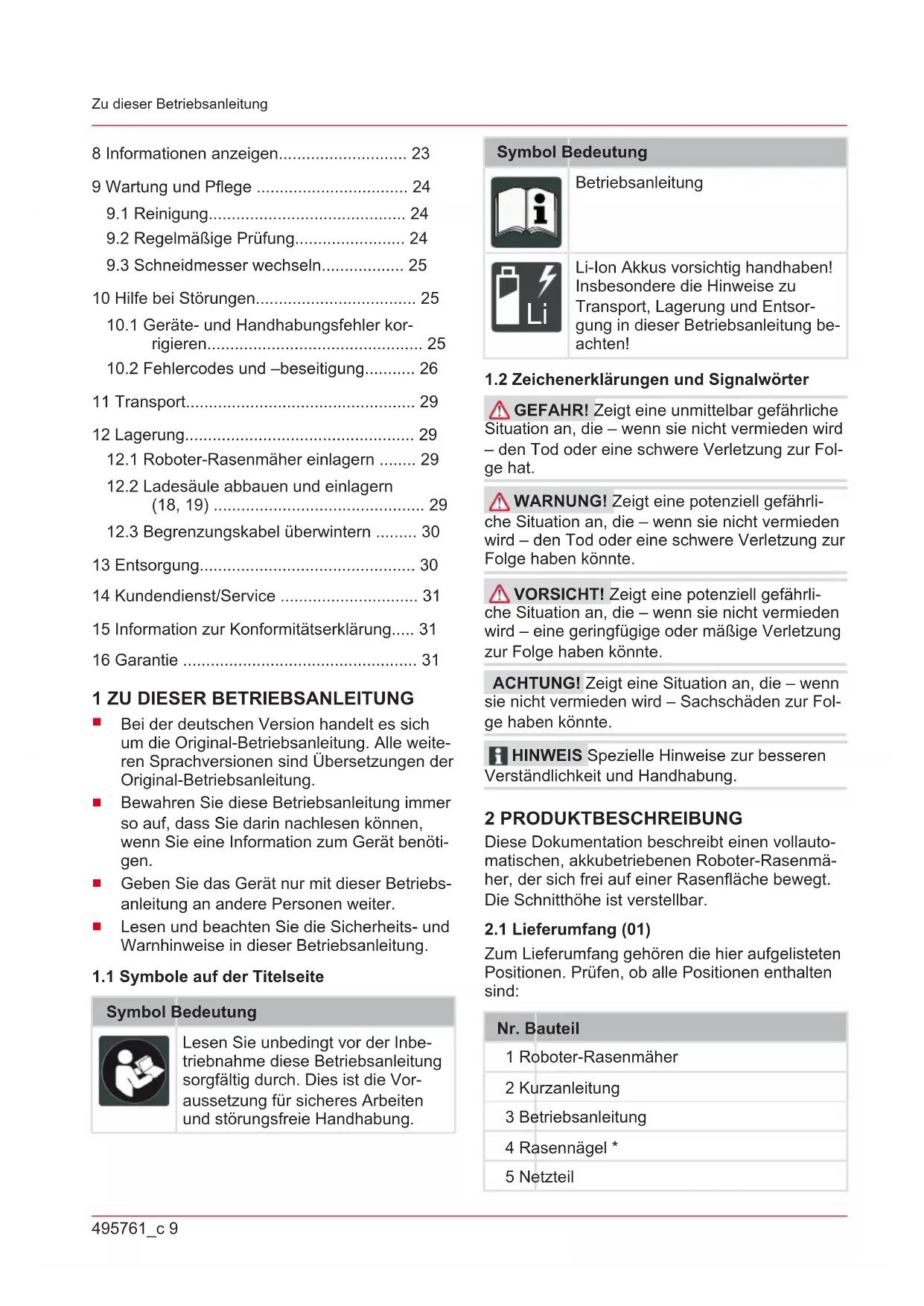 b495761_c 7DE 8 Robolinho Original-Betriebsanleitung ORIGINAL-BETRIEBSANLEITUNG Inhaltsverzeichnis 1 Zu dieser Betriebsanleitung ..................... 9
