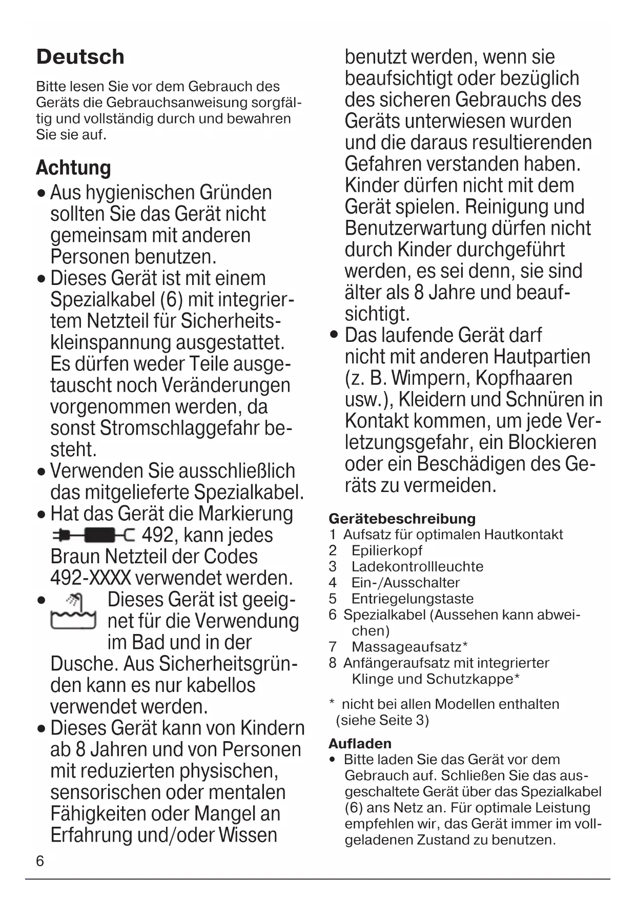 Das laufende Gerät darf nicht mit anderen Hautpartien (z. B. Wimpern, Kopfhaaren usw.), Kleidern und Schnüren in Kontakt kommen, um jede Ver- letzungsgefahr, ein Blockieren oder ein Beschädigen des Ge- räts zu vermeiden. Gerätebeschreibung 1 Aufsatz für optimalen Hautkontakt 2 Epilierkopf 3 Ladekontrollleuchte 4 Ein-/Ausschalter 5 Entriegelungstaste 6 Spezialkabel (Aussehen kann abwei- chen) 7 Massageaufsatz* 8 Anfängeraufsatz mit integrierter Klinge und Schutzkappe*