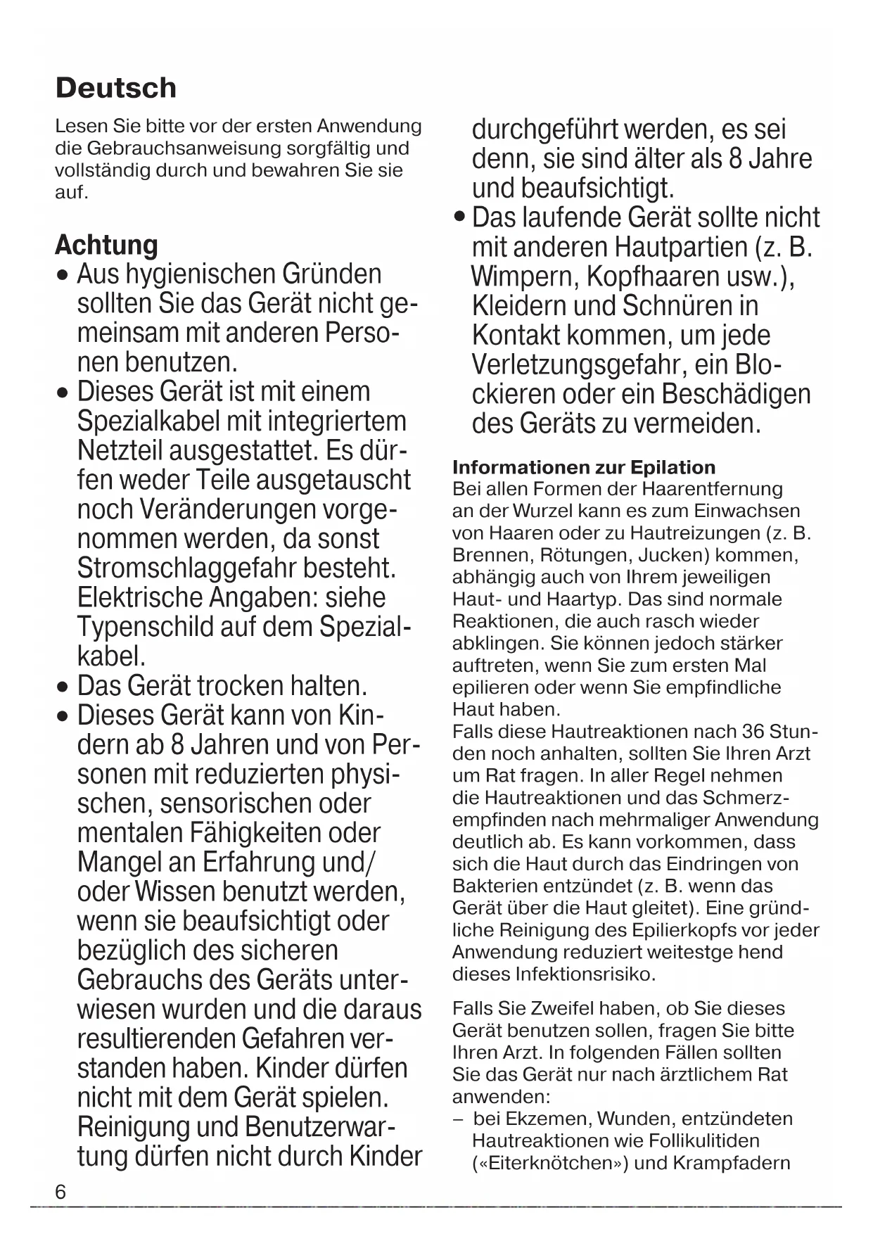 Das laufende Gerät sollte nicht mit anderen Hautpartien (z. B. Wimpern, Kopfhaaren usw.), Kleidern und Schnüren in Kontakt kommen, um jede Verletzungsgefahr, ein Blo- ckieren oder ein Beschädigen des Geräts zu vermeiden. Informationen zur Epilation Bei allen Formen der Haarentfernung an der Wurzel kann es zum Einwachsen von Haaren oder zu Hautreizungen (z. B. Brennen, Rötungen, Jucken) kommen, abhängig auch von Ihrem jeweiligen Haut- und Haartyp. Das sind normale Reaktionen, die auch rasch wieder abklingen. Sie können jedoch stärker auftreten, wenn Sie zum ersten Mal epilieren oder wenn Sie empfindliche Haut haben. Falls diese Hautreaktionen nach 36 Stun- den noch anhalten, sollten Sie Ihren Arzt um Rat fragen. In aller Regel nehmen die Hautreaktionen und das Schmerz- empfinden nach mehrmaliger Anwendung deutlich ab. Es kann vorkommen, dass sich die Haut durch das Eindringen von Bakterien entzündet (z. B. wenn das Gerät über die Haut gleitet). Eine gründ- liche Reinigung des Epilierkopfs vor jeder Anwendung reduziert weitestge hend dieses Infektionsrisiko. Falls Sie Zweifel haben, ob Sie dieses Gerät benutzen sollen, fragen Sie bitte Ihren Arzt. In folgenden Fällen sollten Sie das Gerät nur nach ärztlichem Rat anwenden: – bei Ekzemen, Wunden, entzündeten Hautreaktionen wie Follikulitiden («Eiterknötchen») und Krampfadern Deutsch 91618385_SE_3273_3274_GROCERY_S6-60.indd 691618385_SE_3273_3274_GROCERY_S6-60.indd 6 22.08.17 08:3022.08.17 08:30 CSS APPROVED Effective Date 25Aug2017 GMT - Printed 22Nov2017 Page 6 of 607 – im Bereich von Muttermalen – bei Schwächung der Abwehrkräfte Ihrer Haut, die auftreten kann bei Diabetes, Schwangerschaft, bei Vorliegen des Raynaud Syndroms – bei Blutern oder bei Immunschwäche. Die Epilation ist leichter und angenehmer, wenn die Haare die optimale Länge von 2-5 mm haben. Sind die Haare länger, empfehlen wir zunächst zu rasieren (siehe Abschnitt B) und nach einer Woche die kürzeren, nachwachsenden Haare zu epilieren. Es kann vorkommen, dass dünne nach- wachsende Härchen nicht an die Haut- oberfläche gelangen. Die regelmäßige Verwendung eines Massageschwamms (z. B. nach dem Duschen) oder eines Körper-Peelings hilft, das Einwachsen von Härchen zu verhindern. Damit wird die obere Hautschicht entfernt und feine Haare können an die Oberfläche gelangen. Gerätebeschreibung 1 Massagerollen-Aufsatz 2 Epilierkopf mit Pinzettenwalze 3 Entriegelungsknöpfe 4 Ein-/Ausschalter mit integriertem Licht 5 Steckerbuchse 6 Spezialkabel 7 Rasieraufsatz mit Trimmer-Kappe A So epilieren Sie