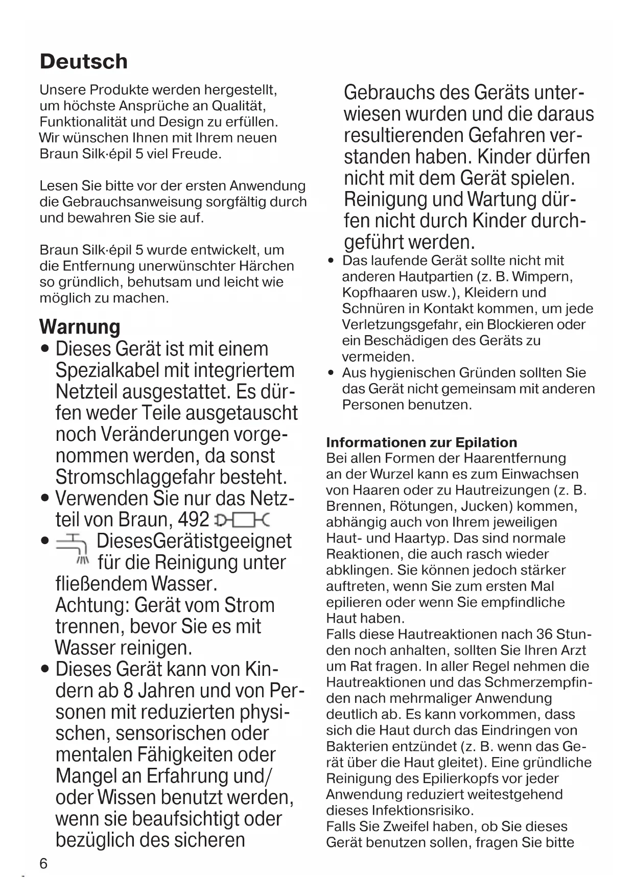 90340813_SE5_Power_MN.indd 590340813_SE5_Power_MN.indd 5 02.06.22 10:4902.06.22 10:496 Unsere Produkte werden hergestellt, um höchste Ansprüche an Qualität, Funktionalität und Design zu erfüllen. Wir wünschen Ihnen mit Ihrem neuen Braun Silk·épil 5 viel Freude. Lesen Sie bitte vor der ersten Anwendung die Gebrauchsanweisung sorgfältig durch und bewahren Sie sie auf. Braun Silk·épil 5 wurde entwickelt, um die Entfernung unerwünschter Härchen so gründlich, behutsam und leicht wie möglich zu machen. Warnung