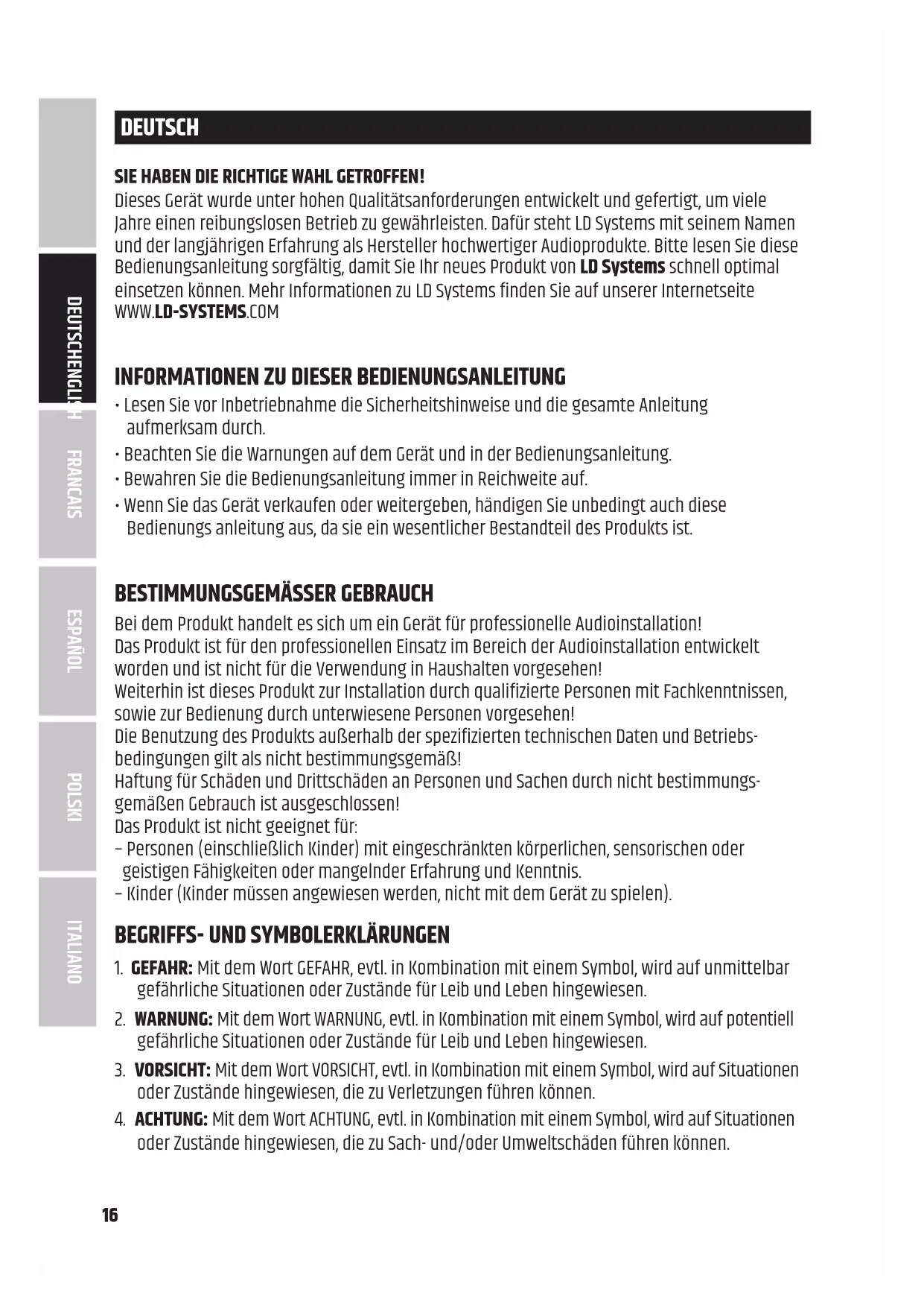 Declarations of conformity for products subject to the LVD, EMC, RoHS Directive can be requested from info@adamhall.com. Declarations of conformity for products subject to RED Directive can be downloaded from www.adamhall.com/compliance/. Subject to misprints and errors, as well as technical or other modifications! DEUTSCHFRANCAIS ESPAÑOL ENGLISH ITALIANO POLSKI16 DEUTSCH SIE HABEN DIE RICHTIGE WAHL GETROFFEN! Dieses Gerät wurde unter hohen Qualitätsanforderungen entwickelt und gefertigt, um viele Jahre einen reibungslosen Betrieb zu gewährleisten. Dafür steht LD Systems mit seinem Namen und der langjährigen Erfahrung als Hersteller hochwertiger Audioprodukte. Bitte lesen Sie diese Bedienungsanleitung sorgfältig, damit Sie Ihr neues Produkt von LD Systems schnell optimal einsetzen können. Mehr Informationen zu LD Systems finden Sie auf unserer Internetseite