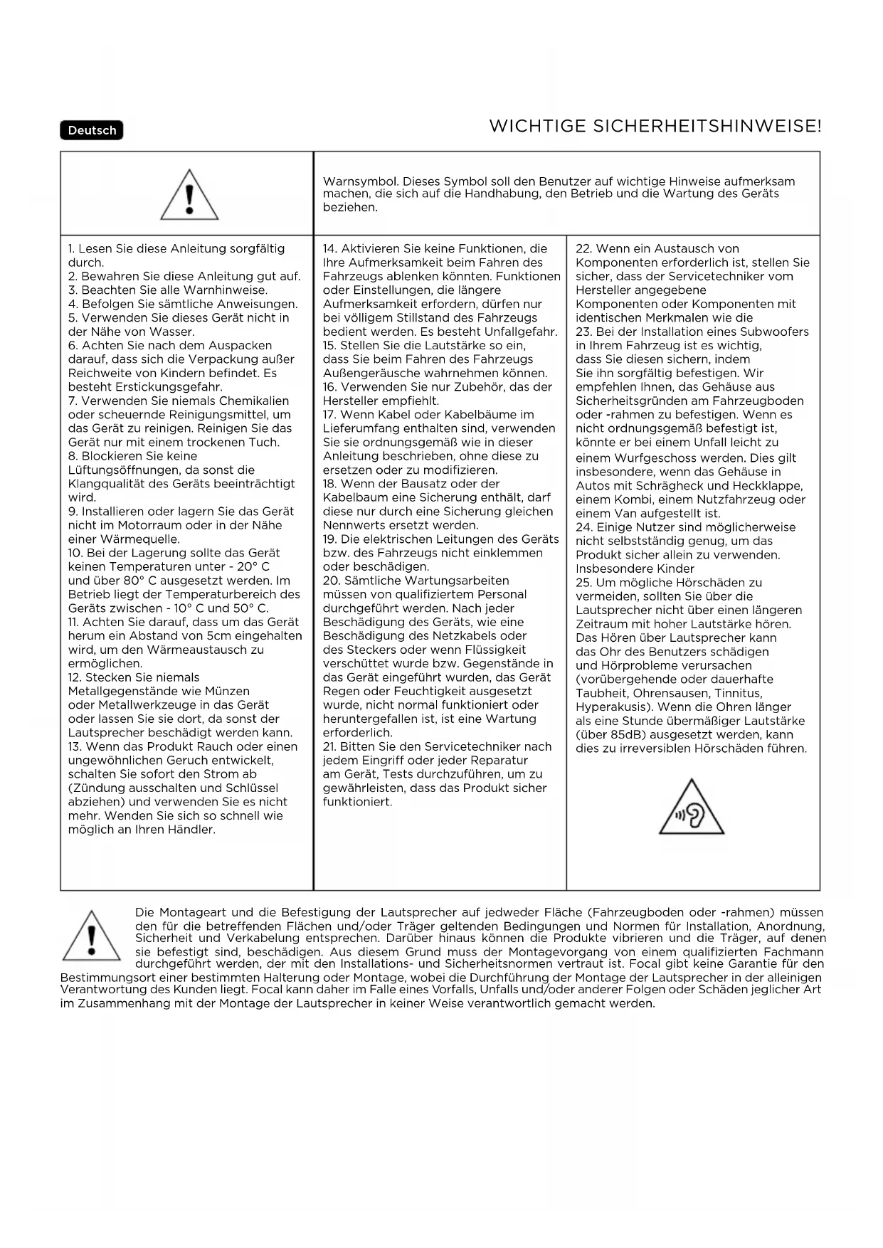 T3Y User manual Footwell Be careful not to touch any wiring other than that required. The crossover must be kept in the footwell only. When reassembling the footwell, make sure to replace the trim correctly so that it covers the seal. Maintenance To care for the IW T3Y 200, ICC T3Y 100, IS T3Y 100 and IC T3Y 100 speaker drivers, simply dust using a dry cloth. If the grille is marked, use a damp duster. Never use solvents, detergents, alcohol or corrosive products, scrapers or scouring utensils to clean the surface of the speaker drivers. Running-in period The IW T3Y 200, ICC T3Y 100, IS T3Y 100 and IC T3Y 100 speaker drivers used are complex mechanical components that require a running-in period to operate at their best. This running-in period varies depending on the conditions in question and may take several weeks. To reduce this time, operate the speaker drivers for about 20 hours at a moderate volume. Once the speaker drivers' characteristics have fully stabilised, you will be able to enjoy the performance of your products to the full. Warranty terms and conditions All Focal loudspeakers are covered by warranty drawn up by the official Focal distributor in your country. Your distributor can provide all details concerning the conditions of warranty. Warranty cover extends at least to that granted by the legal warranty in force in the country where the original purchase invoice was issued.WICHTIGE SICHERHEITSHINWEISE! Deutsch Die Montageart und die Befestigung der Lautsprecher auf jedweder Fläche (Fahrzeugboden oder -rahmen) müssen den für die betreenden Flächen und/oder Träger geltenden Bedingungen und Normen für Installation, Anordnung, Sicherheit und Verkabelung entsprechen. Darüber hinaus können die Produkte vibrieren und die Träger, auf denen sie befestigt sind, beschädigen. Aus diesem Grund muss der Montagevorgang von einem qualifizierten Fachmann durchgeführt werden, der mit den Installations- und Sicherheitsnormen vertraut ist. Focal gibt keine Garantie für den Bestimmungsort einer bestimmten Halterung oder Montage, wobei die Durchführung der Montage der Lautsprecher in der alleinigen Verantwortung des Kunden liegt. Focal kann daher im Falle eines Vorfalls, Unfalls und/oder anderer Folgen oder Schäden jeglicher Art im Zusammenhang mit der Montage der Lautsprecher in keiner Weise verantwortlich gemacht werden. Warnsymbol. Dieses Symbol soll den Benutzer auf wichtige Hinweise aufmerksam machen, die sich auf die Handhabung, den Betrieb und die Wartung des Geräts beziehen.