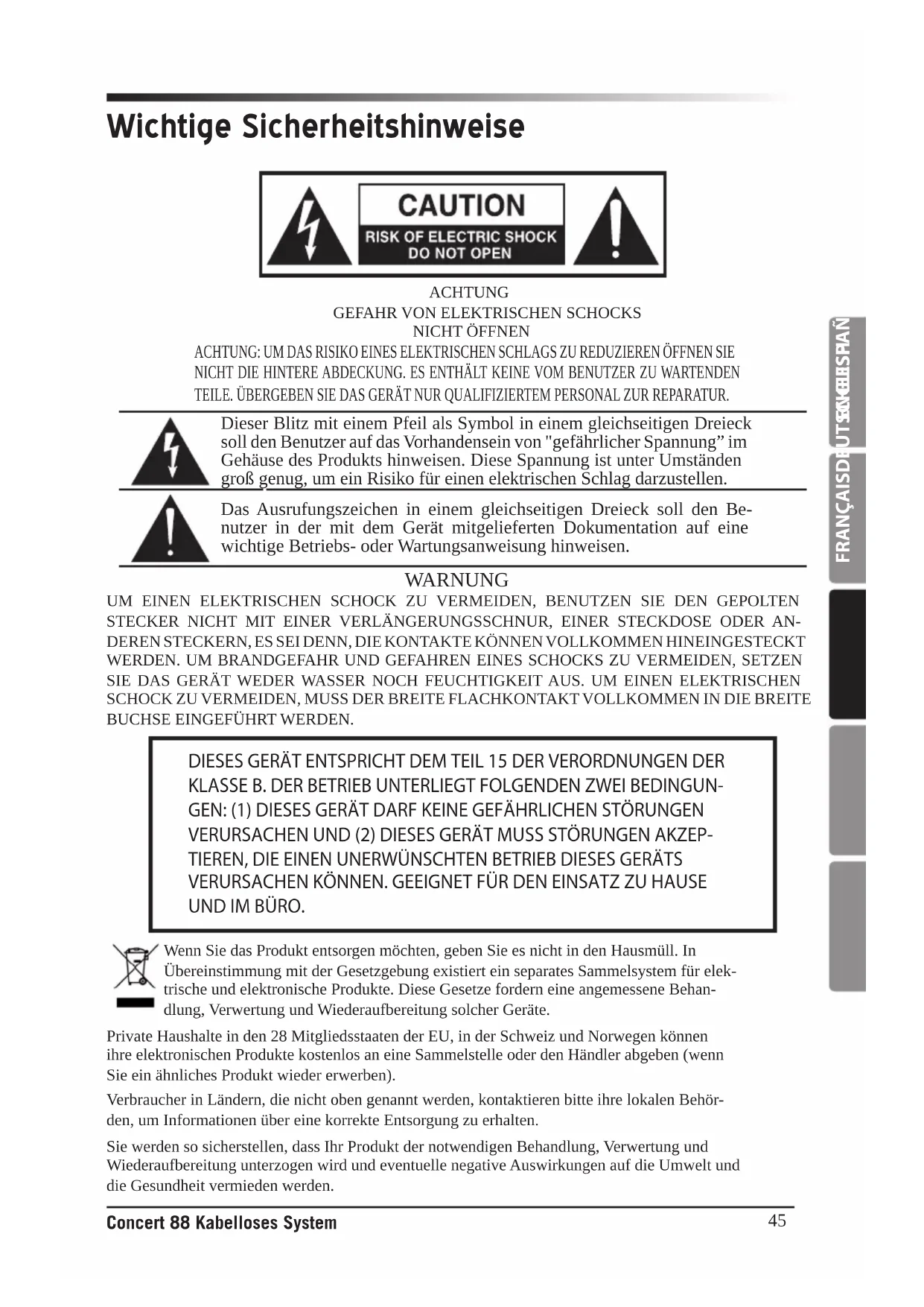 oder Batteriepaket) darf keiner Hitze etwa Sonneneinstrahlung, Feuer oder ähnlichen Einwirkungen ausgesetzt werden.47 Concert 88 Kabelloses System ENGLISH