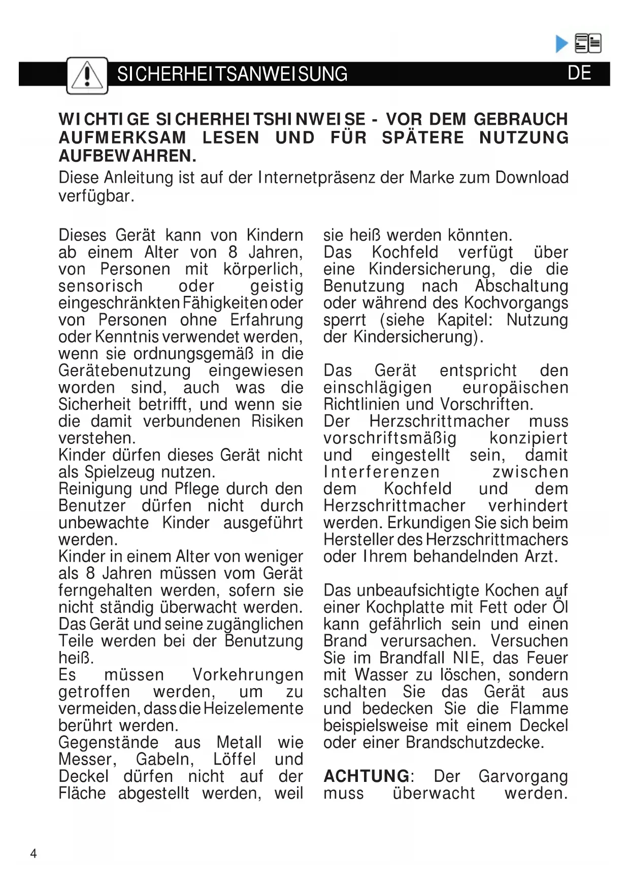 Dieses Gerät kann von Kindern ab einem Alter von 8 Jahren, von Personen mit körperlich, sensorisch oder geistig eingeschränkten Fähigkeiten oder von Personen ohne Erfahrung oder Kenntnis verwendet werden, wenn sie ordnungsgemäß in die Gerätebenutzung eingewiesen worden sind, auch was die Sicherheit betrifft, und wenn sie die damit verbundenen Risiken verstehen. Kinder dürfen dieses Gerät nicht als Spielzeug nutzen. Reinigung und Pflege durch den Benutzer dürfen nicht durch unbewachte Kinder ausgeführt werden. Kinder in einem Alter von weniger als 8 Jahren müssen vom Gerät ferngehalten werden, sofern sie nicht ständig überwacht werden. Das Gerät und seine zugänglichen Teile werden bei der Benutzung heiß. Es müssen Vorkehrungen getroffen werden, um zu vermeiden, dass die Heizelemente berührt werden. Gegenstände aus Metall wie Messer, Gabeln, Löffel und Deckel dürfen nicht auf der Fläche abgestellt werden, weil sie heiß werden könnten. Das Kochfeld verfügt über eine Kindersicherung, die die Benutzung nach Abschaltung oder während des Kochvorgangs sperrt (siehe Kapitel: Nutzung der Kindersicherung). Das Gerät entspricht den einschlägigen europäischen Richtlinien und Vorschriften. Der Herzschrittmacher muss vorschriftsmäßig konzipiert und eingestellt sein, damit Interferenzen zwischen dem Kochfeld und dem Herzschrittmacher verhindert werden. Erkundigen Sie sich beim Hersteller des Herzschrittmachers oder Ihrem behandelnden Arzt. Das unbeaufsichtigte Kochen auf einer Kochplatte mit Fett oder Öl kann gefährlich sein und einen Brand verursachen. Versuchen Sie im Brandfall NIE, das Feuer mit Wasser zu löschen, sondern schalten Sie das Gerät aus und bedecken Sie die Flamme beispielsweise mit einem Deckel oder einer Brandschutzdecke. ACHTUNG: Der Garvorgang muss überwacht werden.