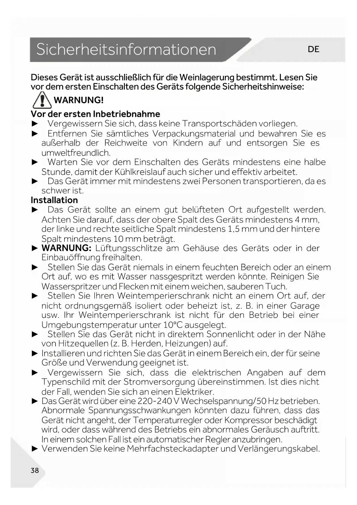 Sicher heit sinf o rmat io nen Dieses Gerät ist ausschließlich für die Weinlagerung bestimmt. Lesen Sie vor dem ersten Einschalten des Geräts folgende Sicherheitshinweise: WARNUNG!