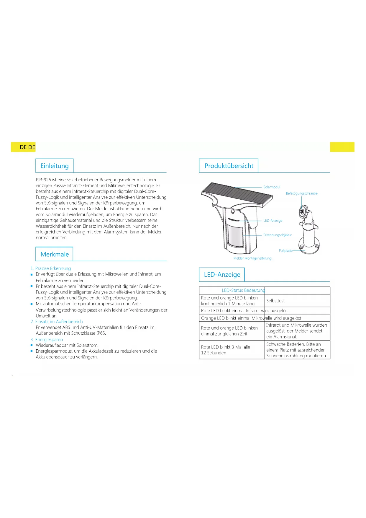 sunlight is ensured.EN EN Ground Connect to Control Panel Make sure the control panel is in pairing state, trigger the detector to alarm until the panel gives out a beep, which indicates the connection succeeded. Arm the system, trigger the detector again, and the siren of control panel will hoot to conrm that the connection is successful. Specications Power supply: 18650 3.7 V 1800 mAh rechargeable lithium battery Standby current: < 0.16 mA Solar panel output current: 2000LX illumination ≥ 4 mA Battery standby time: <150 days Detection scope: 8 m/110° Wireless transmitting distance: < 80 m (in open area) Radio frequency: 433 MHz ERP (dBm) .: -2.94 Operating condition: Temperature: -20°C ~ + 55°C Relative humidity: < 90% (non-condensing) Housing material: PC+ABS+ANTI-UV Detector dimensions (L x W x H): 186 x 200 x 125 mm Bracket dimensions (L x W x H): 58 x 58 x 120 mmDE DE Einleitung PIR-926 ist eine solarbetriebener Bewegungsmelder mit einem einzigen Passiv-Infrarot-Element und Mikrowellentechnologie. Er besteht aus einem Infrarot-Steuerchip mit digitaler Dual-Core- Fuzzy-Logik und intelligenter Analyse zur effektiven Unterscheidung von Störsignalen und Signalen der Körperbewegung, um Fehlalarme zu reduzieren. Der Melder ist akkubetrieben und wird vom Solarmodul wiederaufgeladen, um Energie zu sparen. Das einzigartige Gehäusematerial und die Struktur verbessern seine Wasserdichtheit für den Einsatz im Außenbereich. Nur nach der erfolgreichen Verbindung mit dem Alarmsystem kann der Melder normal arbeiten. Merkmale