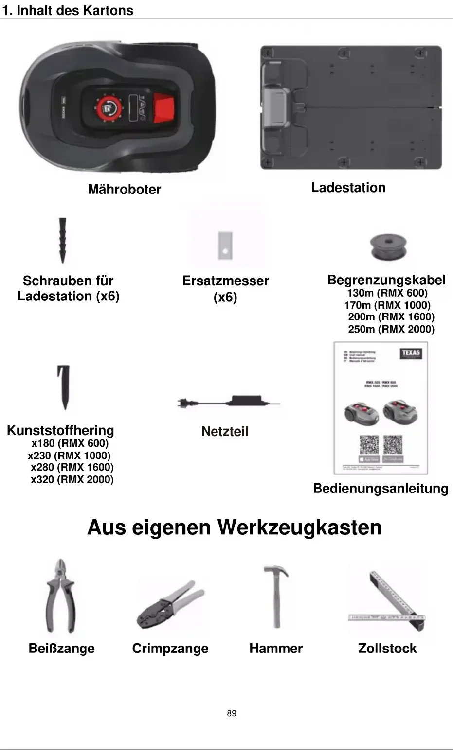 Mähroboter Ladestation Schrauben für Ladestation (x6) Ersatzmesser (x6) Begrenzungskabel 130m (RMX 600) 170m (RMX 1000) 200m (RMX 1600) 250m (RMX 2000) Kunststoffhering x180 (RMX 600) x230 (RMX 1000) x280 (RMX 1600) x320 (RMX 2000) Netzteil Bedienungsanleitung Beißzange Crimpzange Hammer Zollstock Aus eigenen Werkzeugkasten90