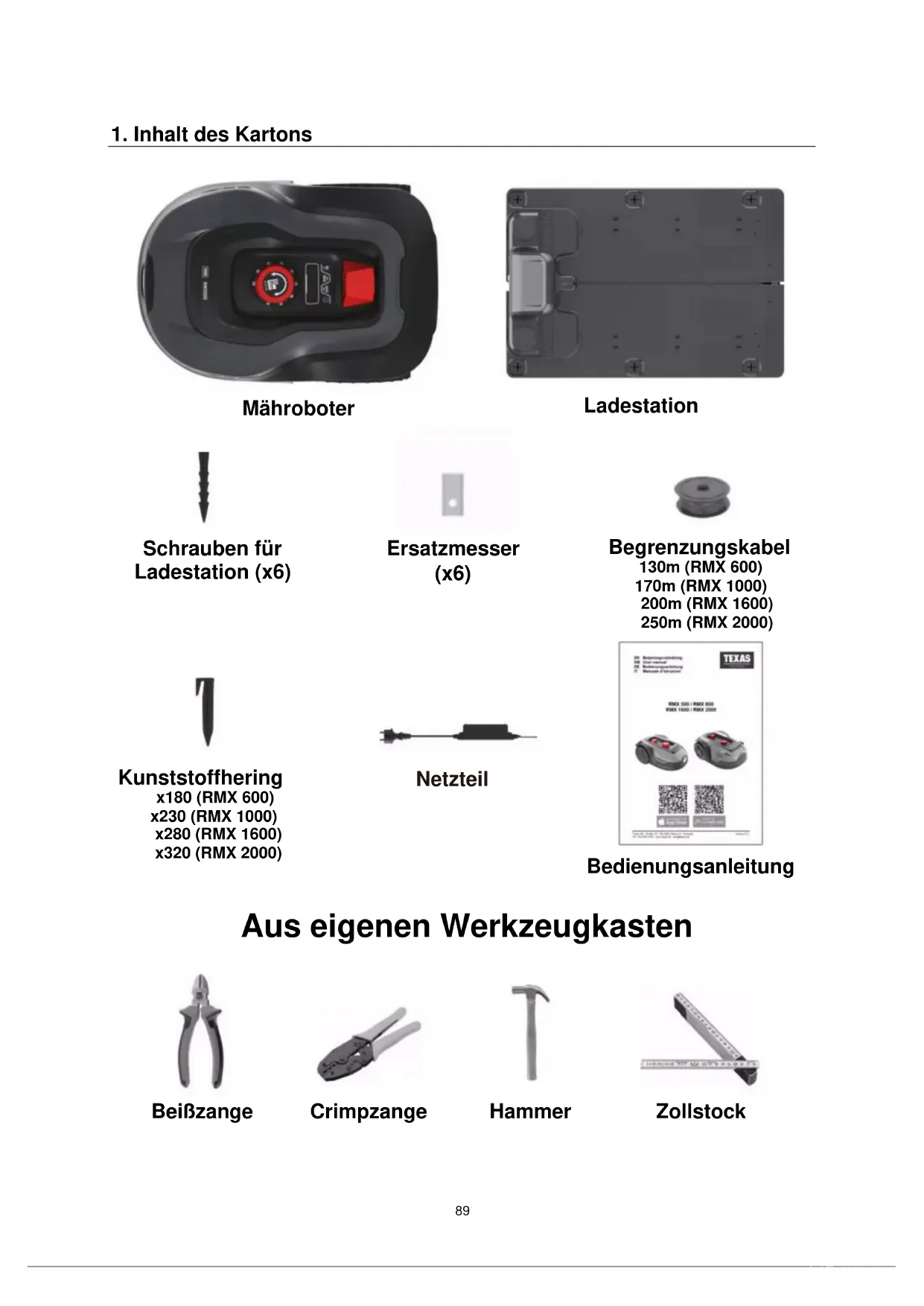 Mähroboter Ladestation Schrauben für Ladestation (x6) Ersatzmesser (x6) Begrenzungskabel 130m (RMX 600) 170m (RMX 1000) 200m (RMX 1600) 250m (RMX 2000) Kunststoffhering x180 (RMX 600) x230 (RMX 1000) x280 (RMX 1600) x320 (RMX 2000) Netzteil Bedienungsanleitung Beißzange Crimpzange Hammer Zollstock Aus eigenen Werkzeugkasten90