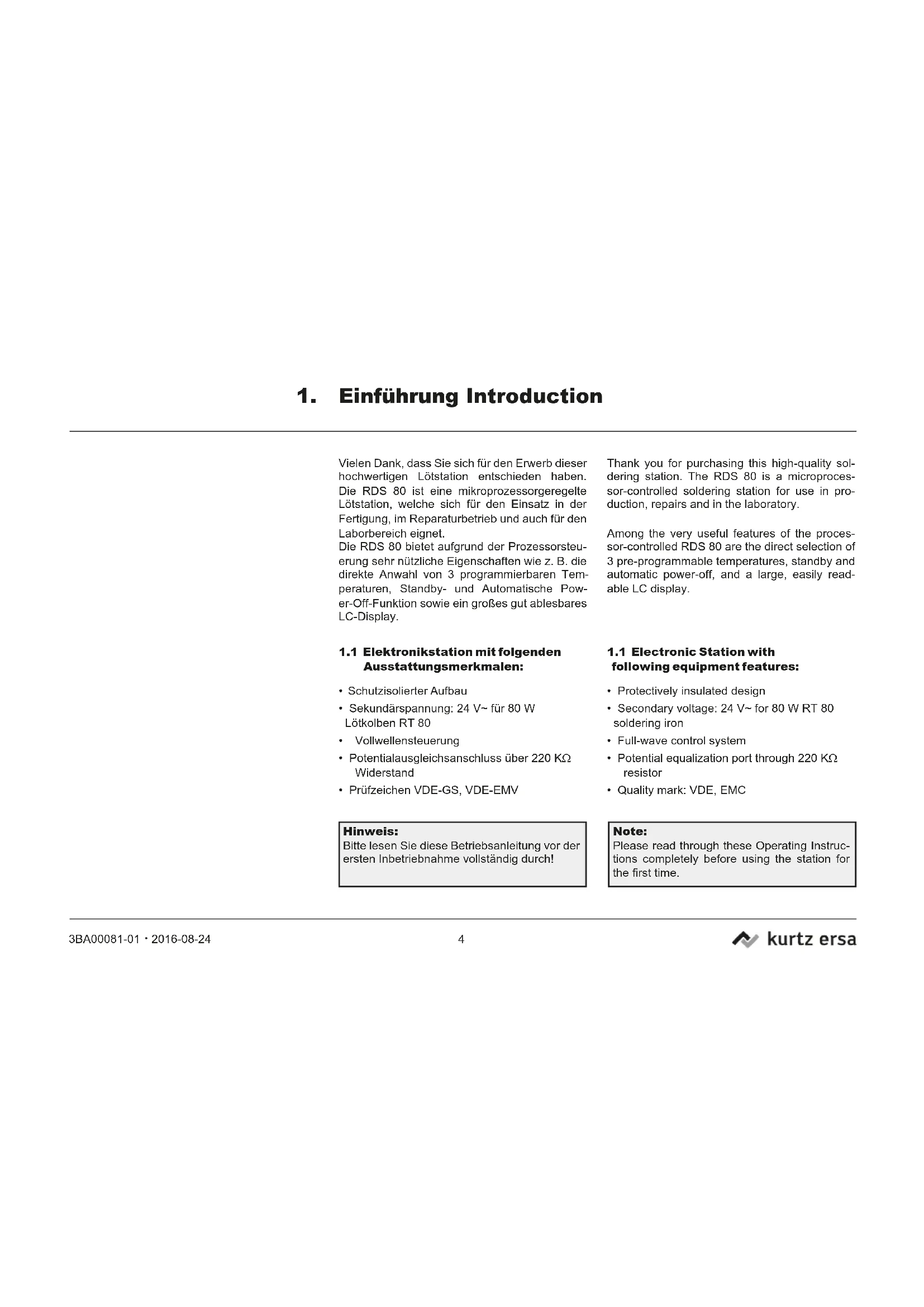 Einführung Introduction Vielen Dank, dass Sie sich für den Erwerb dieser hochwertigen Lötstation entschieden haben. Die RDS 80 ist eine mikroprozessorgeregelte Lötstation, welche sich für den Einsatz in der Fertigung, im Reparaturbetrieb und auch für den Laborbereich eignet. Die RDS 80 bietet aufgrund der Prozessorsteu- erung sehr nützliche Eigenschaften wie z. B. die direkte Anwahl von 3 programmierbaren Tem- peraturen, Standby- und Automatische Pow- er-Off-Funktion sowie ein großes gut ablesbares LC-Display.