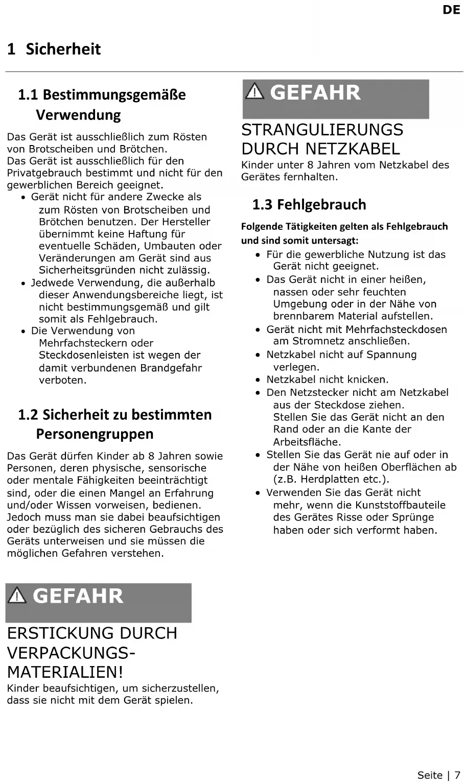 Verwendung Das Gerät ist ausschließlich zum Rösten von Brotscheiben und Brötchen. Das Gerät ist ausschließlich für den Privatgebrauch bestimmt und nicht für den gewerblichen Bereich geeignet. • Gerät nicht für andere Zwecke als zum Rösten von Brotscheiben und Brötchen benutzen. Der Hersteller übernimmt keine Haftung für eventuelle Schäden, Umbauten oder Veränderungen am Gerät sind aus Sicherheitsgründen nicht zulässig. • Jedwede Verwendung, die außerhalb dieser Anwendungsbereiche liegt, ist nicht bestimmungsgemäß und gilt somit als Fehlgebrauch. • Die Verwendung von Mehrfachsteckern oder Steckdosenleisten ist wegen der damit verbundenen Brandgefahr verboten.