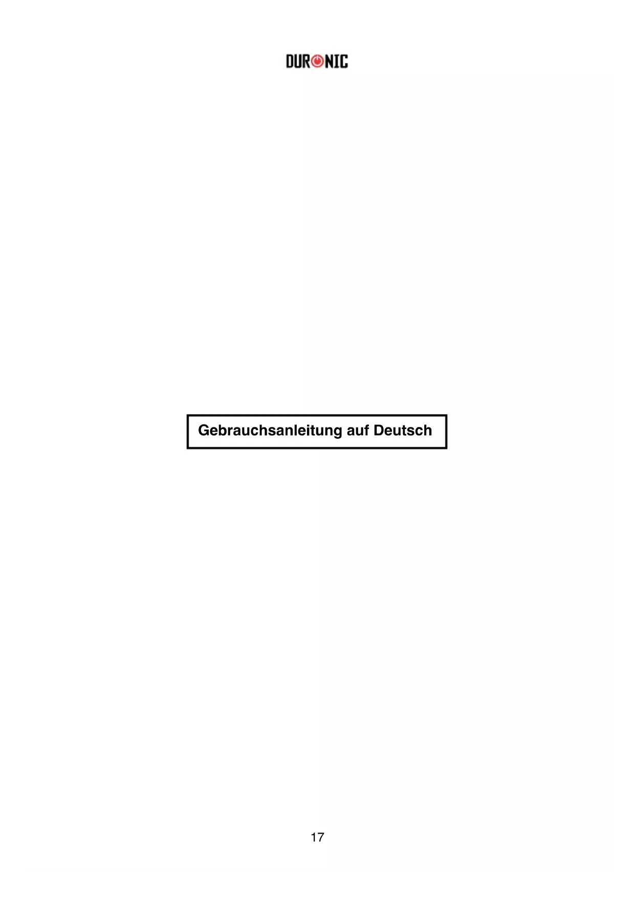 Versuchen Sie niemals, die Teile selbst auszutauschen und das Gerät zu reparieren. Nehmen Sie keine Veränderungen am Gerät vor, die nicht in der Gebrauchsanweisung beschrieben sind. Das Gerät enthält spannungsführende Teile. Reparaturen dürfen nur von Duronic unter Verwendung von Original-Ersatzteilen und -Zubehör durchgeführt werden.