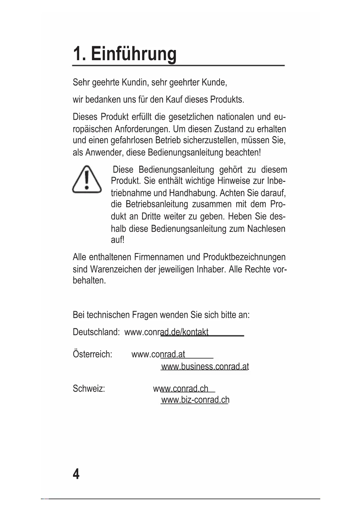 Sehr geehrte Kundin, sehr geehrter Kunde, wir bedanken uns für den Kauf dieses Produkts. Dieses Produkt erfüllt die gesetzlichen nationalen und eu- ropäischen Anforderungen. Um diesen Zustand zu erhalten und einen gefahrlosen Betrieb sicherzustellen, müssen Sie, als Anwender, diese Bedienungsanleitung beachten! Diese Bedienungsanleitung gehört zu diesem Produkt. Sie enthält wichtige Hinweise zur Inbe- triebnahme und Handhabung. Achten Sie darauf, die Betriebsanleitung zusammen mit dem Pro- dukt an Dritte weiter zu geben. Heben Sie des- halb diese Bedienungsanleitung zum Nachlesen auf! Alle enthaltenen Firmennamen und Produktbezeichnungen sind Warenzeichen der jeweiligen Inhaber. Alle Rechte vor- behalten. Bei technischen Fragen wenden Sie sich bitte an: Deutschland: www.conrad.de/kontakt Österreich: www.conrad.at www.business.conrad.at Schweiz: www.conrad.ch www.biz-conrad.ch5