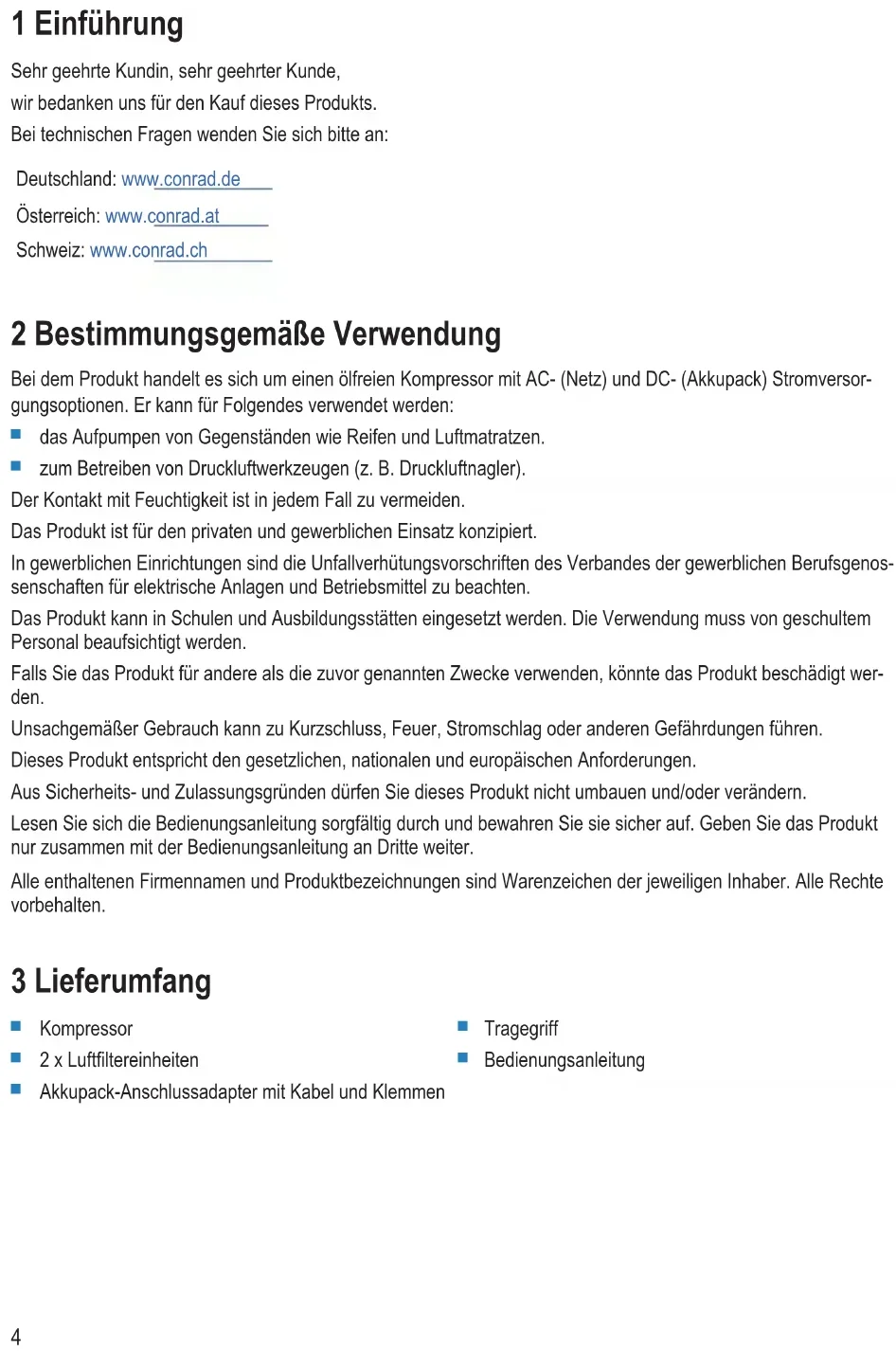 zum Betreiben von Druckluftwerkzeugen (z. B. Druckluftnagler). Der Kontakt mit Feuchtigkeit ist in jedem Fall zu vermeiden. Das Produkt ist für den privaten und gewerblichen Einsatz konzipiert. In gewerblichen Einrichtungen sind die Unfallverhütungsvorschriften des Verbandes der gewerblichen Berufsgenos- senschaften für elektrische Anlagen und Betriebsmittel zu beachten. Das Produkt kann in Schulen und Ausbildungsstätten eingesetzt werden. Die Verwendung muss von geschultem Personal beaufsichtigt werden. Falls Sie das Produkt für andere als die zuvor genannten Zwecke verwenden, könnte das Produkt beschädigt wer- den. Unsachgemäßer Gebrauch kann zu Kurzschluss, Feuer, Stromschlag oder anderen Gefährdungen führen. Dieses Produkt entspricht den gesetzlichen, nationalen und europäischen Anforderungen. Aus Sicherheits- und Zulassungsgründen dürfen Sie dieses Produkt nicht umbauen und/oder verändern. Lesen Sie sich die Bedienungsanleitung sorgfältig durch und bewahren Sie sie sicher auf. Geben Sie das Produkt nur zusammen mit der Bedienungsanleitung an Dritte weiter. Alle enthaltenen Firmennamen und Produktbezeichnungen sind Warenzeichen der jeweiligen Inhaber. Alle Rechte vorbehalten. 3 Lieferumfang