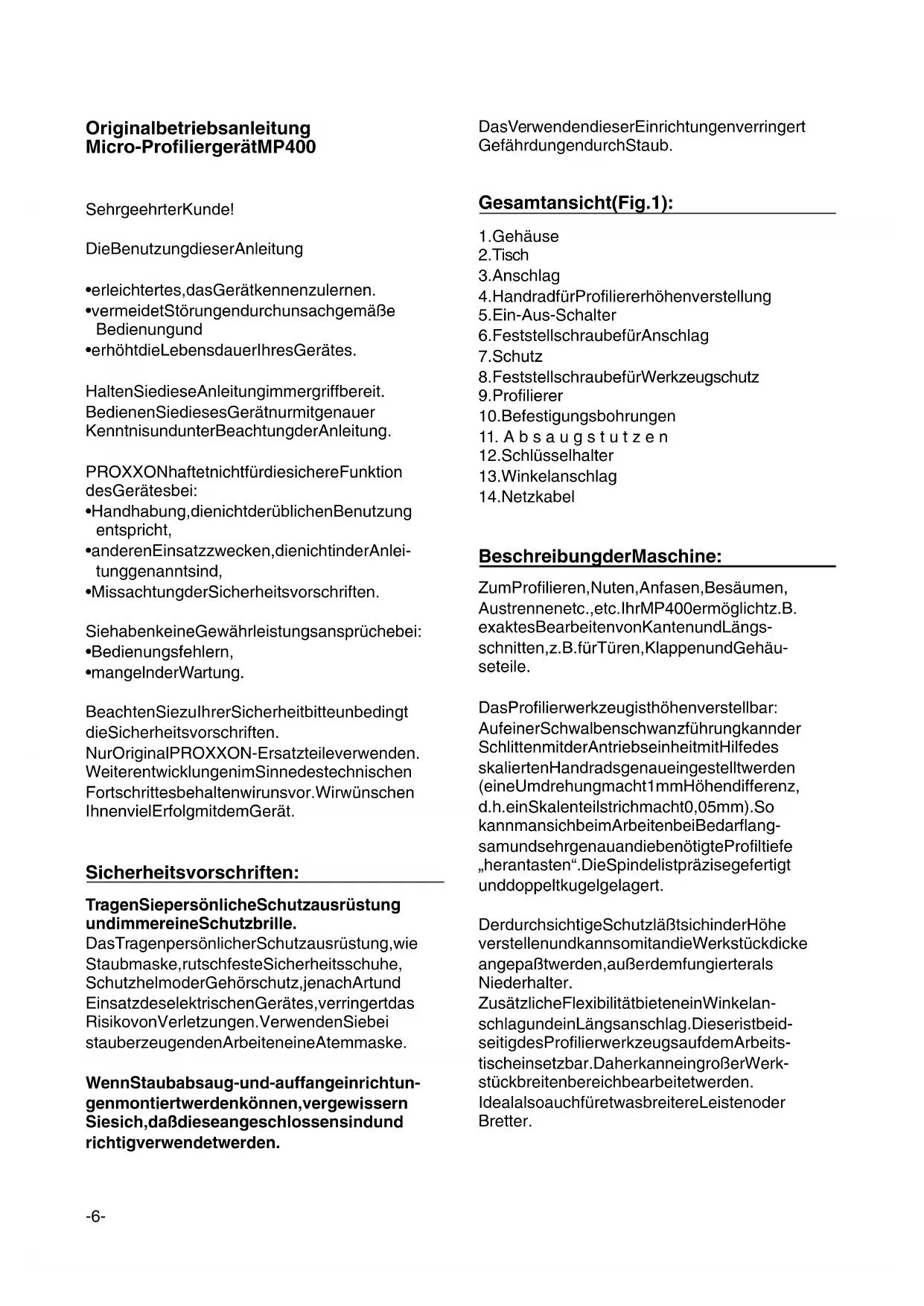 Beschreibung der Maschine: Zum Profilieren, Nuten, Anfasen, Besäumen, Austrennen etc., etc. Ihr MP 400 ermöglicht z. B. exaktes Bearbeiten von Kanten und Längs- schnitten, z. B. für Türen, Klappen und Gehäu- seteile. Das Profilierwerkzeug ist höhenverstellbar: Auf einer Schwalbenschwanzführung kann der Schlitten mit der Antriebseinheit mit Hilfe des skalierten Handrads genau eingestellt werden (eine Umdrehung macht 1 mm Höhendifferenz, d. h. ein Skalenteilstrich macht 0,05 mm). So kann man sich beim Arbeiten bei Bedarf lang- sam und sehr genau an die benötigte Profiltiefe „herantasten“. Die Spindel ist präzise gefertigt und doppelt kugelgelagert. Der durchsichtige Schutz läßt sich in der Höhe verstellen und kann somit an die Werkstückdicke angepaßt werden, außerdem fungiert er als Niederhalter. Zusätzliche Flexibilität bieten ein Winkelan- schlag und ein Längsanschlag. Dieser ist beid- seitig des Profilierwerkzeugs auf dem Arbeits- tisch einsetzbar. Daher kann ein großer Werk- stückbreitenbereich bearbeitet werden. Ideal also auch für etwas breitere Leisten oder Bretter.Saugschlauch 1 des Staubsaugers in den An- schlussstutzen 2 stecken. Einsetzen und Auswechseln des Profilier- werkzeugs: Achtung! Bei allen unten beschriebenen Arbeiten ist es zweckmäßig, die höhenverstellbare Schutzein- richtung (siehe Fig. 1, Pos. 7) ganz nach oben zu stellen. Netzstecker ziehen! Einsetzen des Profilierwerkzeugs: Achtung! Stellen Sie sicher, daß das Werkzeug für Dreh- zahlen bis 25000 Umdrehungen pro Minute ge- eignet ist.