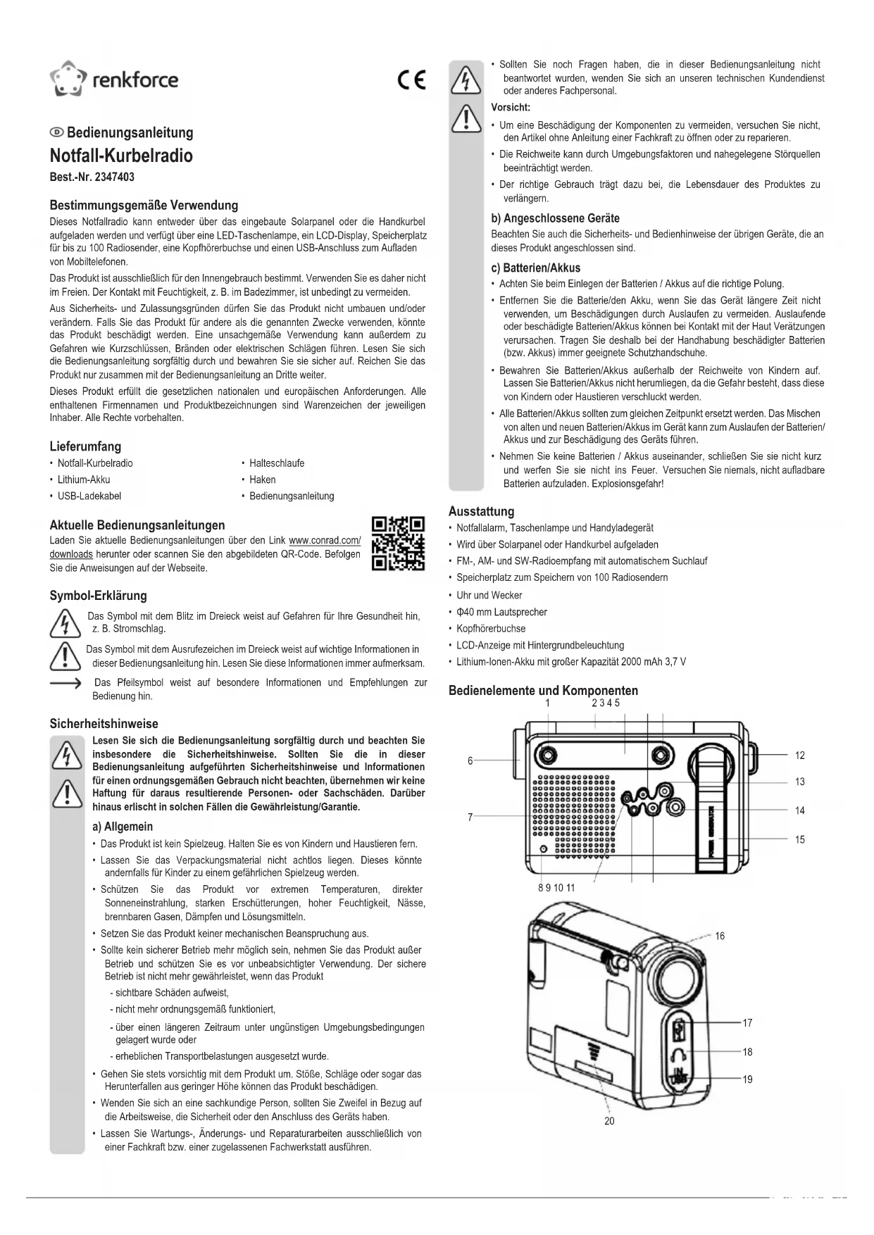 Bedienungsanleitung Notfall-Kurbelradio Best.-Nr. 2347403 Bestimmungsgemäße Verwendung Dieses Notfallradio kann entweder über das eingebaute Solarpanel oder die Handkurbel aufgeladen werden und verfügt über eine LED-Taschenlampe, ein LCD-Display, Speicherplatz für bis zu 100 Radiosender, eine Kopfhörerbuchse und einen USB-Anschluss zum Auaden von Mobiltelefonen. Das Produkt ist ausschließlich für den Innengebrauch bestimmt. Verwenden Sie es daher nicht im Freien. Der Kontakt mit Feuchtigkeit, z. B. im Badezimmer, ist unbedingt zu vermeiden. Aus Sicherheits- und Zulassungsgründen dürfen Sie das Produkt nicht umbauen und/oder verändern. Falls Sie das Produkt für andere als die genannten Zwecke verwenden, könnte das Produkt beschädigt werden. Eine unsachgemäße Verwendung kann außerdem zu Gefahren wie Kurzschlüssen, Bränden oder elektrischen Schlägen führen. Lesen Sie sich die Bedienungsanleitung sorgfältig durch und bewahren Sie sie sicher auf. Reichen Sie das Produkt nur zusammen mit der Bedienungsanleitung an Dritte weiter. Dieses Produkt erfüllt die gesetzlichen nationalen und europäischen Anforderungen. Alle enthaltenen Firmennamen und Produktbezeichnungen sind Warenzeichen der jeweiligen Inhaber. Alle Rechte vorbehalten. Lieferumfang