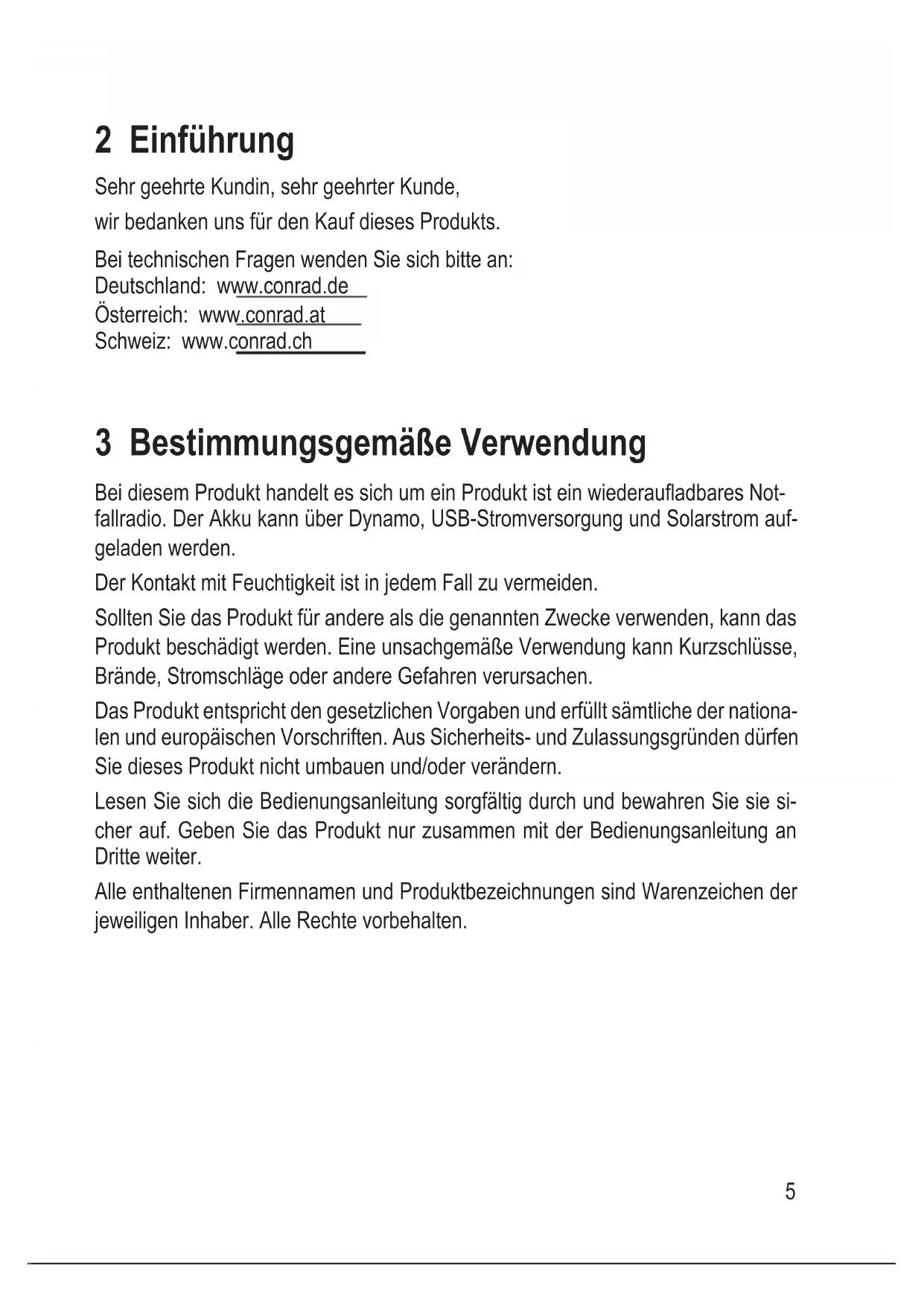 2 Einführung Sehr geehrte Kundin, sehr geehrter Kunde, wir bedanken uns für den Kauf dieses Produkts. Bei technischen Fragen wenden Sie sich bitte an: Deutschland: www.conrad.de Österreich: www.conrad.at Schweiz: www.conrad.ch 3 Bestimmungsgemäße Verwendung Bei diesem Produkt handelt es sich um ein Produkt ist ein wiederauadbares Not- fallradio. Der Akku kann über Dynamo, USB-Stromversorgung und Solarstrom auf- geladen werden. Der Kontakt mit Feuchtigkeit ist in jedem Fall zu vermeiden. Sollten Sie das Produkt für andere als die genannten Zwecke verwenden, kann das Produkt beschädigt werden. Eine unsachgemäße Verwendung kann Kurzschlüsse, Brände, Stromschläge oder andere Gefahren verursachen. Das Produkt entspricht den gesetzlichen Vorgaben und erfüllt sämtliche der nationa- len und europäischen Vorschriften. Aus Sicherheits- und Zulassungsgründen dürfen Sie dieses Produkt nicht umbauen und/oder verändern. Lesen Sie sich die Bedienungsanleitung sorgfältig durch und bewahren Sie sie si- cher auf. Geben Sie das Produkt nur zusammen mit der Bedienungsanleitung an Dritte weiter. Alle enthaltenen Firmennamen und Produktbezeichnungen sind Warenzeichen der jeweiligen Inhaber. Alle Rechte vorbehalten.6 4 Lieferumfang