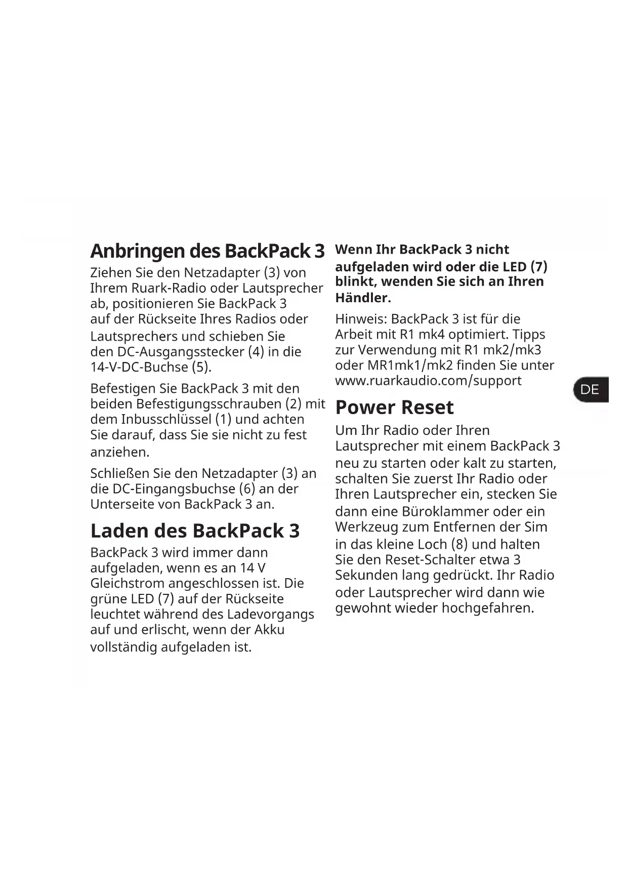 Anbringen des BackPack 3 Ziehen Sie den Netzadapter (3) von Ihrem Ruark-Radio oder Lautsprecher ab, positionieren Sie BackPack 3 auf der Rückseite Ihres Radios oder Lautsprechers und schieben Sie den DC-Ausgangsstecker (4) in die 14-V-DC-Buchse (5). Befestigen Sie BackPack 3 mit den beiden Befestigungsschrauben (2) mit dem Inbusschlüssel (1) und achten Sie darauf, dass Sie sie nicht zu fest anziehen. Schließen Sie den Netzadapter (3) an die DC-Eingangsbuchse (6) an der Unterseite von BackPack 3 an. Laden des BackPack 3 BackPack 3 wird immer dann aufgeladen, wenn es an 14 V Gleichstrom angeschlossen ist. Die grüne LED (7) auf der Rückseite leuchtet während des Ladevorgangs auf und erlischt, wenn der Akku vollständig aufgeladen ist. Wenn Ihr BackPack 3 nicht aufgeladen wird oder die LED (7) blinkt, wenden Sie sich an Ihren Händler. Hinweis: BackPack 3 ist für die Arbeit mit R1 mk4 optimiert. Tipps zur Verwendung mit R1 mk2/mk3 oder MR1mk1/mk2 nden Sie unter www.ruarkaudio.com/support Power Reset Um Ihr Radio oder Ihren Lautsprecher mit einem BackPack 3 neu zu starten oder kalt zu starten, schalten Sie zuerst Ihr Radio oder Ihren Lautsprecher ein, stecken Sie dann eine Büroklammer oder ein Werkzeug zum Entfernen der Sim in das kleine Loch (8) und halten Sie den Reset-Schalter etwa 3 Sekunden lang gedrückt. Ihr Radio oder Lautsprecher wird dann wie gewohnt wieder hochgefahren.Sicherheitshinweise