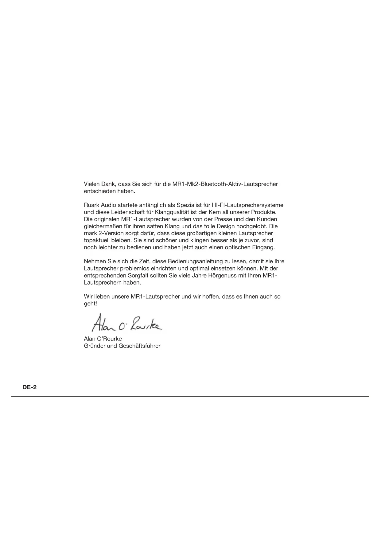 -Lautsprecher MR1 mk2DE-2 Vielen Dank, dass Sie sich für die MR1-Mk2-Bluetooth-Aktiv-Lautsprecher entschieden haben. Ruark Audio startete anfänglich als Spezialist für HI-FI-Lautsprechersysteme und diese Leidenschaft für Klangqualität ist der Kern all unserer Produkte. Die originalen MR1-Lautsprecher wurden von der Presse und den Kunden gleichermaßen für ihren satten Klang und das tolle Design hochgelobt. Die mark 2-Version sorgt dafür, dass diese großartigen kleinen Lautsprecher topaktuell bleiben. Sie sind schöner und klingen besser als je zuvor, sind noch leichter zu bedienen und haben jetzt auch einen optischen Eingang. Nehmen Sie sich die Zeit, diese Bedienungsanleitung zu lesen, damit sie Ihre Lautsprecher problemlos einrichten und optimal einsetzen können. Mit der entsprechenden Sorgfalt sollten Sie viele Jahre Hörgenuss mit Ihren MR1- Lautsprechern haben. Wir lieben unsere MR1-Lautsprecher und wir hoffen, dass es Ihnen auch so geht! Alan O’Rourke Gründer und GeschäftsführerDE-3