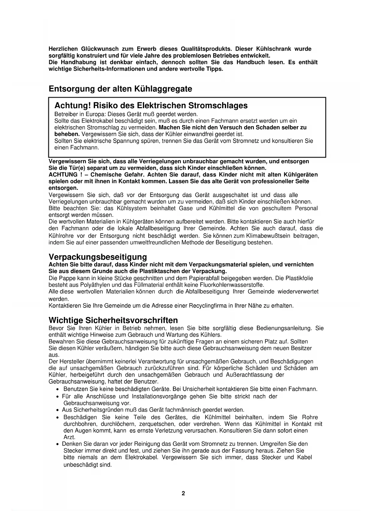 Gebrauchsanweisung • User Manual Guide d'utilisation • Gebruiksaanwijzing Für einen sicheren Betrieb lesen Sie bitte vor dem Gebrauch diese Bedienungsanleitung. Deutsch ....................................................................... Seite 02 To ensure safe operation, please read this instruction manual thoroughly before use. English ......................................................................... Page 05 Afin d'assurer un bon fonctionnement, veuillez lire ce manuel attentivement avant d'utiliser cet appareil. Français ........................................................................ Page 07 Lees de gebruiksaanwijzing aandachtig alvorens het toestel in gebruik te nemen. Nederlands………………………………………………………………………Blz. 092 Herzlichen Glückwunsch zum Erwerb dieses Qualitätsprodukts. Dieser Kühlschrank wurde sorgfältig konstruiert und für viele Jahre des problemlosen Betriebes entwickelt. Die Handhabung ist denkbar einfach, dennoch sollten Sie das Handbuch lesen. Es enthält wichtige Sicherheits-Informationen und andere wertvolle Tipps. Entsorgung der alten Kühlaggregate Vergewissern Sie sich, dass alle Verriegelungen unbrauchbar gemacht wurden, und entsorgen Sie die Tür(e) separat um zu vermeiden, dass sich Kinder einschließen können. ACHTUNG ! – Chemische Gefahr. Achten Sie darauf, dass Kinder nicht mit alten Kühlgeräten spielen oder mit ihnen in Kontakt kommen. Lassen Sie das alte Gerät von professioneller Seite entsorgen. Vergewissern Sie sich, daß vor der Entsorgung das Gerät ausgeschaltet ist und dass alle Verriegelungen unbrauchbar gemacht wurden um zu vermeiden, daß sich Kinder einschließen können. Bitte beachten Sie: das Kühlsystem beinhaltet Gase und Kühlmittel die von geschultem Personal entsorgt werden müssen. Die wertvollen Materialien in Kühlgeräten können aufbereitet werden. Bitte kontaktieren Sie auch hierfür den Fachmann oder die lokale Abfallbeseitigung Ihrer Gemeinde. Achten Sie auch darauf, dass die Kühlrohre vor der Entsorgung nicht beschädigt werden. Sie können zum Klimabewußtsein beitragen, indem Sie auf einer passenden umweltfreundlichen Methode der Beseitigung bestehen. Verpackungsbeseitigung Achten Sie bitte darauf, dass Kinder nicht mit dem Verpackungsmaterial spielen, und vernichten Sie aus diesem Grunde auch die Plastiktaschen der Verpackung. Die Pappe kann in kleine Stücke geschnitten und dem Papierabfall beigegeben werden. Die Plastikfolie besteht aus Polyäthylen und das Füllmaterial enthält keine Fluorkohlenwasserstoffe. Alle diese wertvollen Materialien können durch die Abfallbeseitigung Ihrer Gemeinde wiederverwertet werden. Kontaktieren Sie Ihre Gemeinde um die Adresse einer Recyclingfirma in Ihrer Nähe zu erhalten. Wichtige Sicherheitsvorschriften Bevor Sie Ihren Kühler in Betrieb nehmen, lesen Sie bitte sorgfältig diese Bedienungsanleitung. Sie enthält wichtige Hinweise zum Gebrauch und Wartung des Kühlers. Bewahren Sie diese Gebrauchsanweisung für zukünftige Fragen an einem sicheren Platz auf. Sollten Sie diesen Kühler veräußern, händigen Sie bitte auch diese Gebrauchsanweisung dem neuen Besitzer aus. Der Hersteller übernimmt keinerlei Verantwortung für unsachgemäßen Gebrauch, und Beschädigungen die auf unsachgemäßen Gebrauch zurückzuführen sind. Für körperliche Schäden und Schäden am Kühler, herbeigeführt durch den unsachgemäßen Gebrauch und Außerachtlassung der Gebrauchsanweisung, haftet der Benutzer.